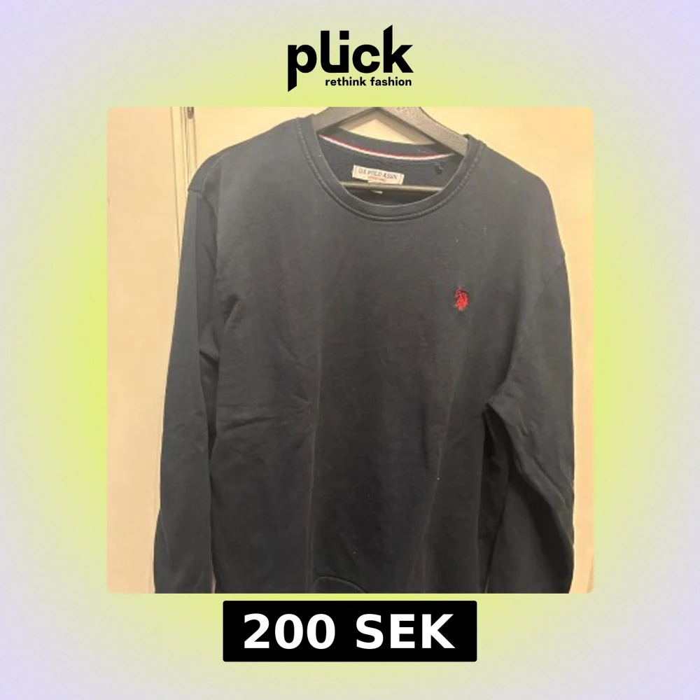 Säljer en stilren mörkblå tröja från U.S. Polo Assn. med ett rött broderat emblem på bröstet. Tröjan har långa ärmar och rund halsringning, perfekt för en avslappnad look.