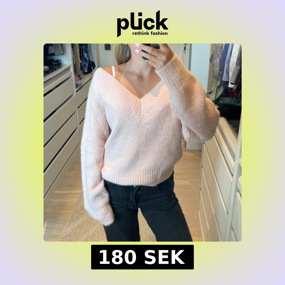 Supermjuk och fluffig ljusrosa stickad tröja från H&M med v-ringning och långa ärmar. Tröjan har ribbade muddar och en lite loose passform men passar mig perfekt som har strl xs-s, perfekt att styla med jeans eller kjol.