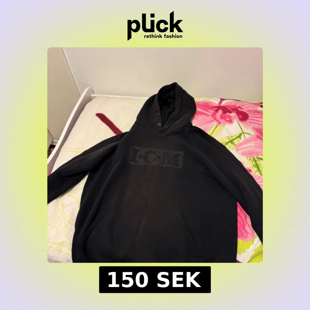 Säljer en svart hoodie från ICM med stor huva och magficka. Tröjan har en diskret logga framtill i samma färg som tyget och är perfekt för en avslappnad stil. Klassisk passform och mjukt material.