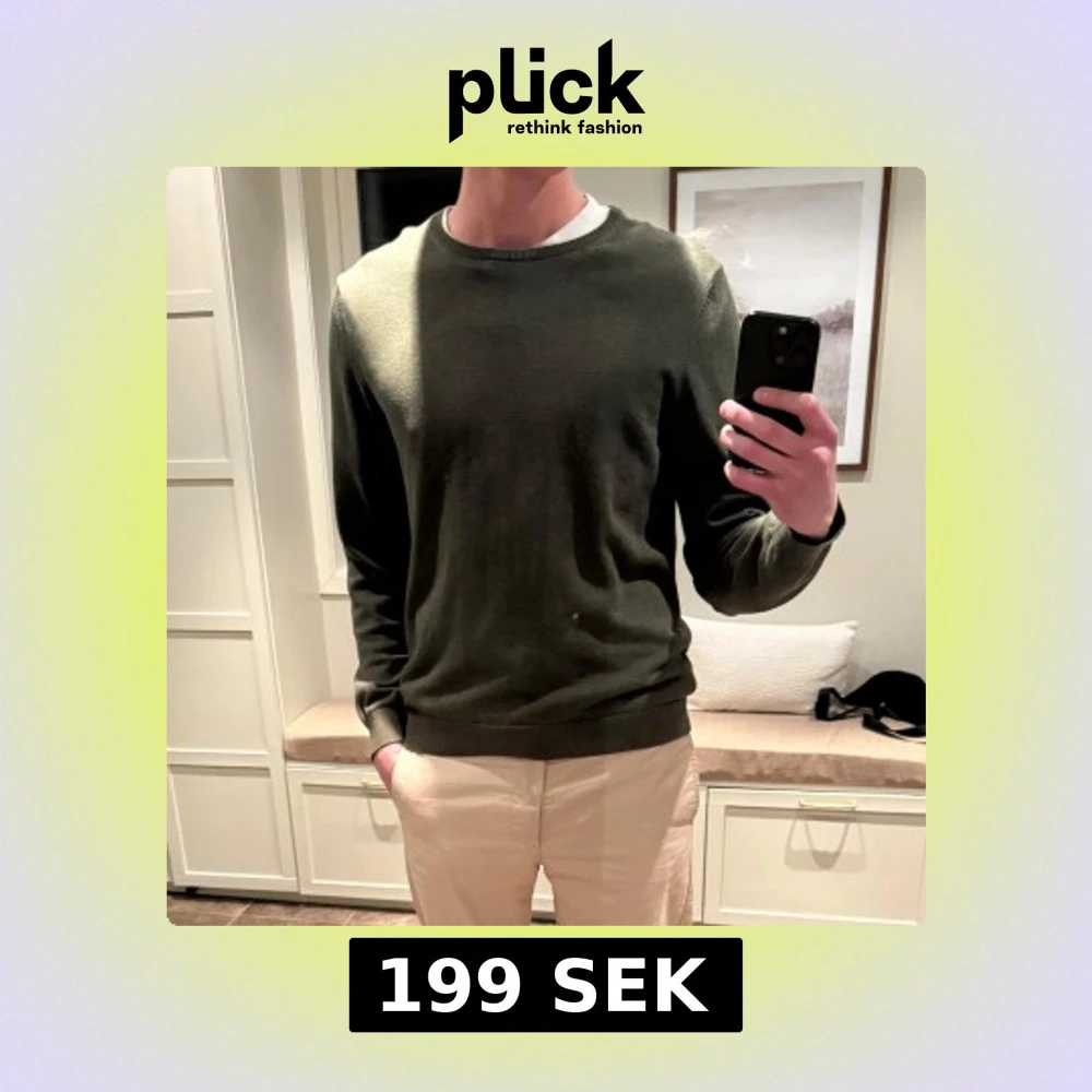 Säljer en stilren olivgrön tröja med rund halsringning. Tröjan har långa ärmar och ribbade muddar vid ärmslut och nederkant. Perfekt för en avslappnad look.