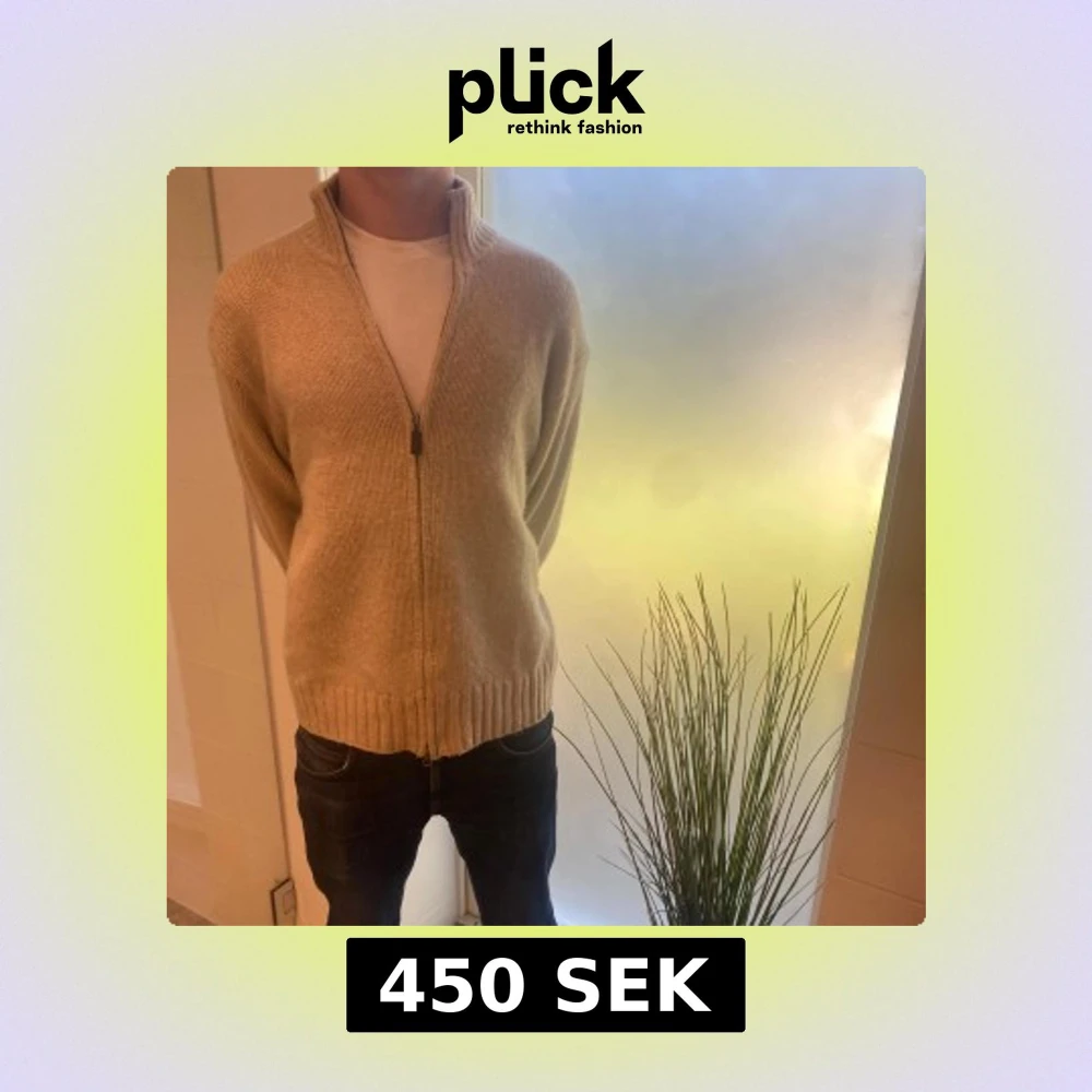 Beige stickad kofta med hel dragkedja och hög krage. Koftan har ribbade muddar vid ärmslut och nederkant, vilket ger en snygg och avslappnad look. Perfekt för lager-på-lager under kyliga dagar.