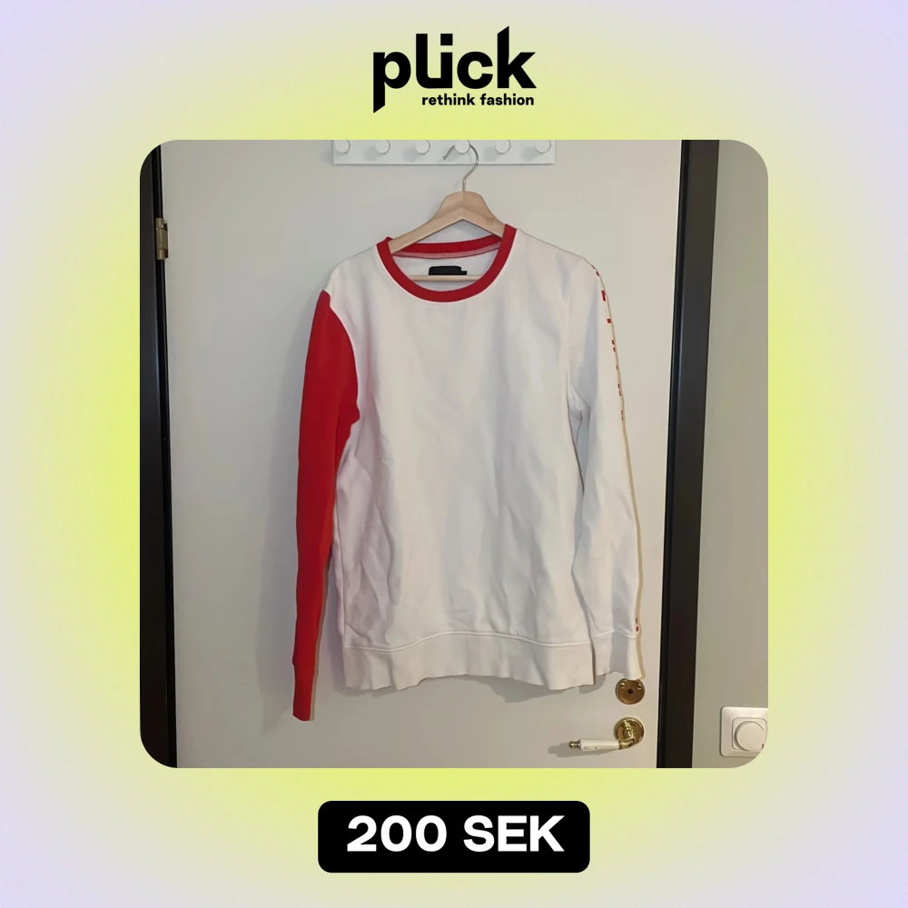 Säljer en snygg vit tröja med röda detaljer från Produkt. Den har långa ärmar med text längs ena ärmen och en röd krage. Perfekt för en casual look eller en chill dag hemma. Passar bra till jeans eller joggers! Pris går alltid att förhandlas!