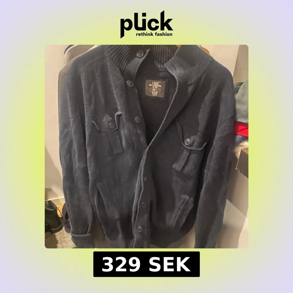 Snygg mörkblå kofta från L.O.G.G. H&M i storlek L. Koftan har ribbad krage, knäppning framtill med stora knappar och två bröstfickor med lock och knapp. Perfekt för lager-på-lager och chill stil.