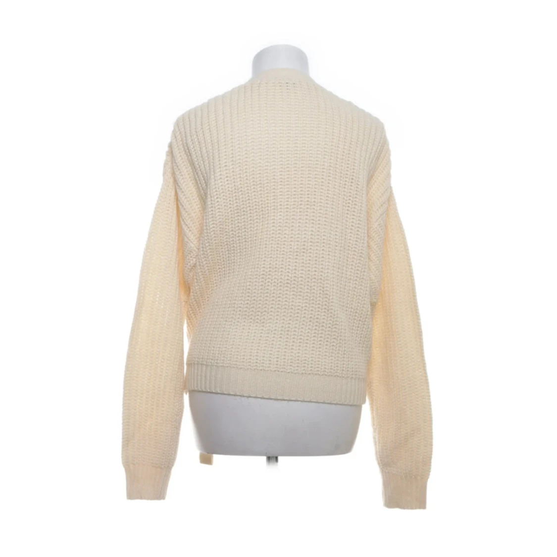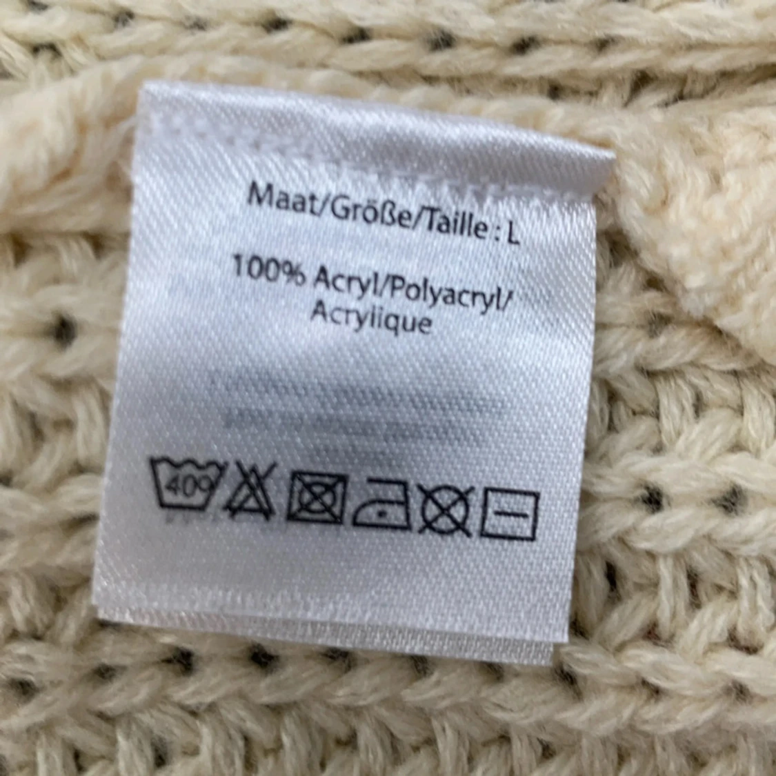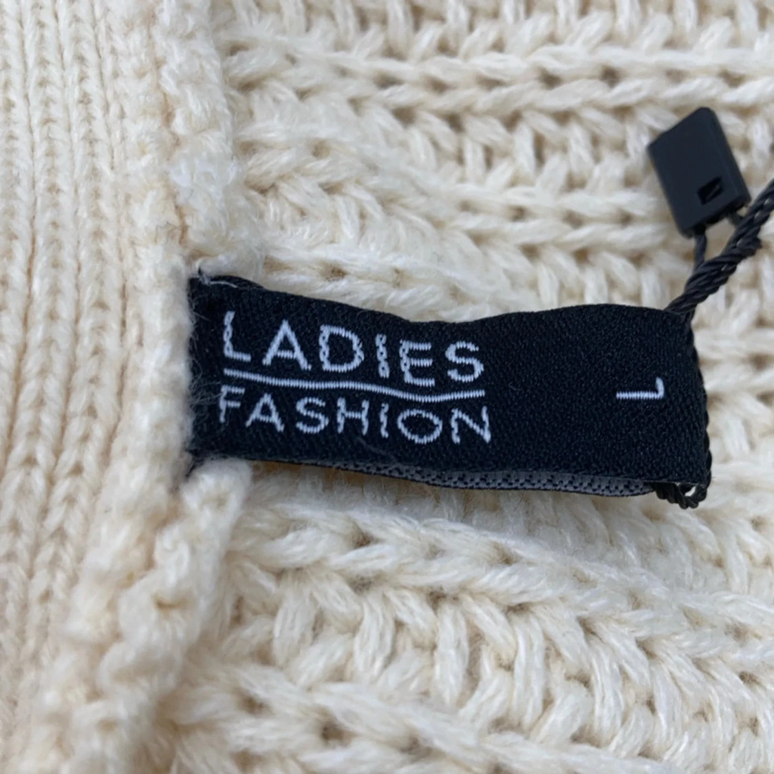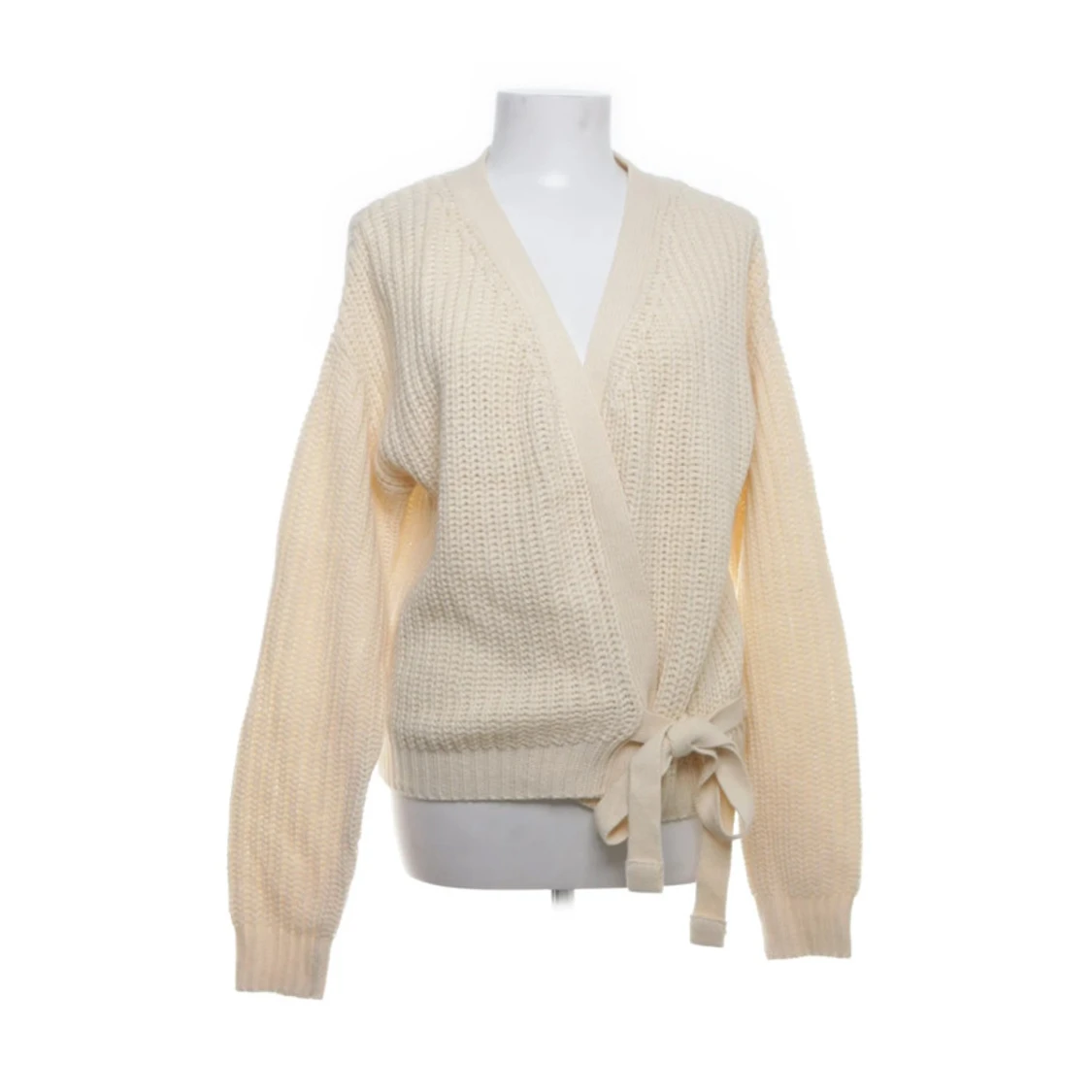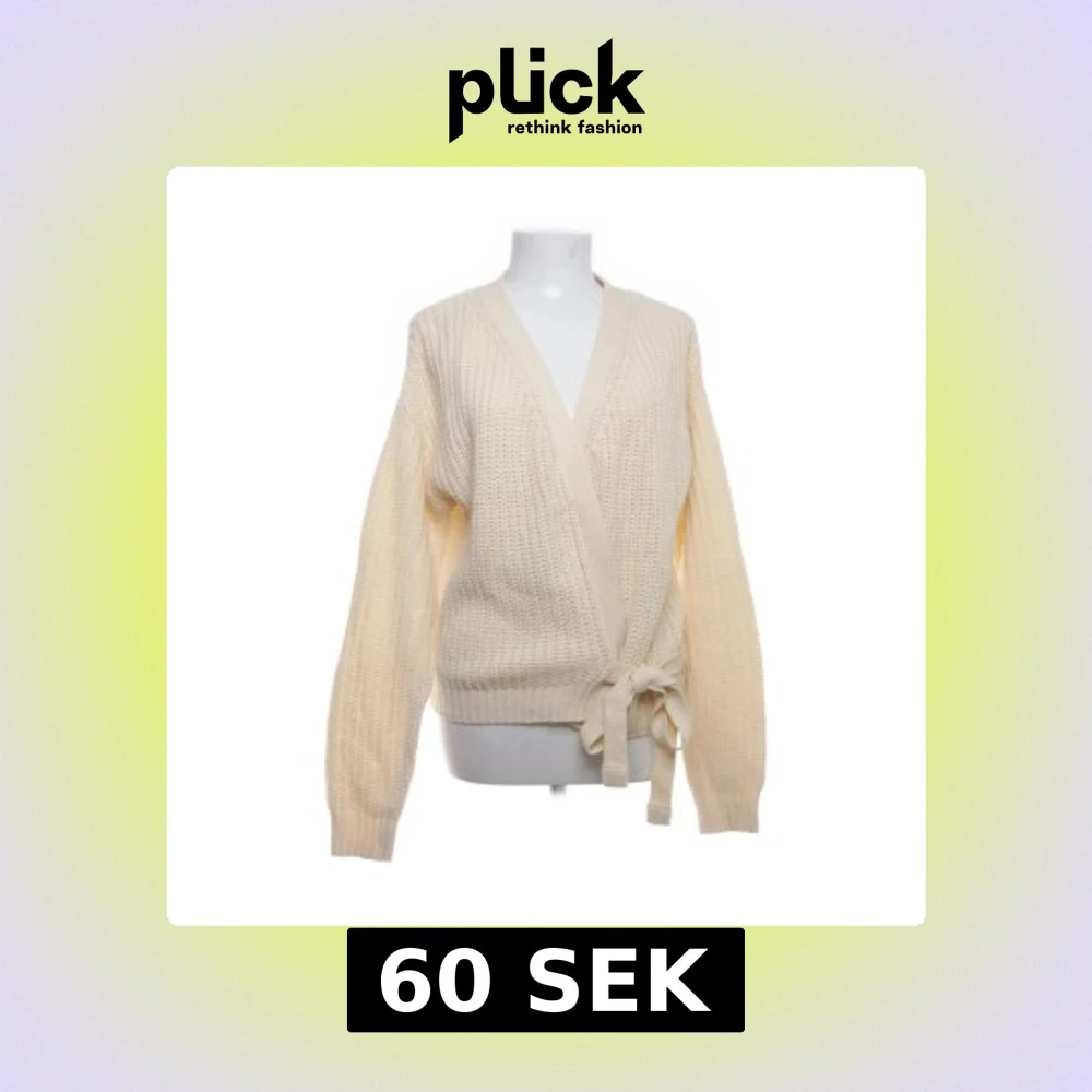 Säljer en beige stickad kofta från Ladies Fashion i storlek L. Koftan har omlottmodell med knytband i midjan och grovstickad struktur.