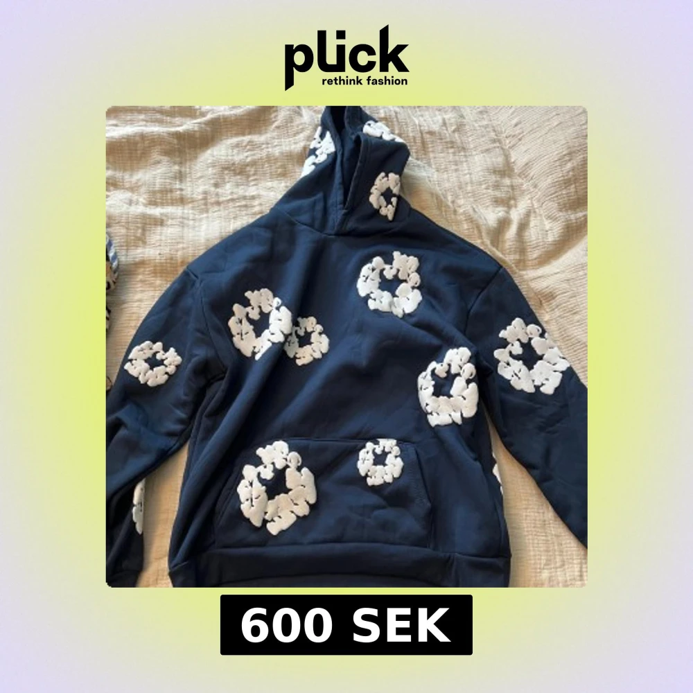 Säljer en marinblå hoodie från Denim Tears med stora vita blommönster över hela tröjan. Tröjan har huva, känguruficka och är långärmad. Perfekt för dig som vill sticka ut med en unik och trendig look.