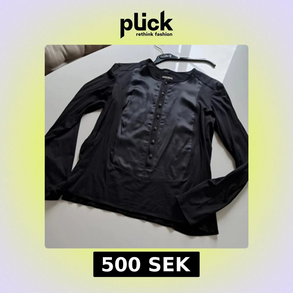 Stilren svart skjortan från Roberto Cavalli at H&M i storlek L. Framsidan har en snygg silkespanel med knappar och resten är i mjuk bomull. Långärmad modell med rund halsringning och diskret emblem bak. Perfekt för dig som gillar en clean och elegant look.