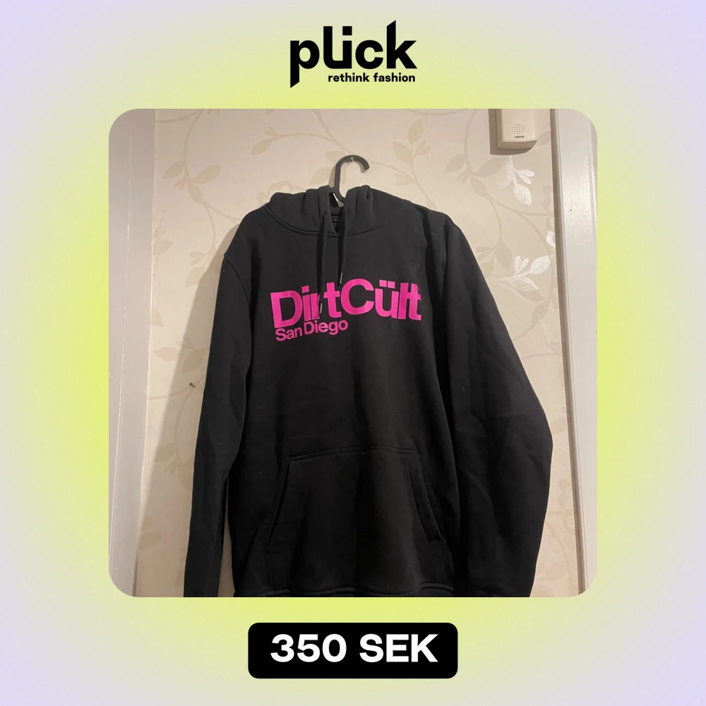 Säljer en svart hoodie från DirtCult med rosa text 'San Diego' på framsidan. Den har en klassisk känguruficka och justerbar huva. Perfekt för en avslappnad stil eller kyliga dagar. Passar både till vardags och chillkvällar. Använd 2-3 gånger så den är som precis ny.