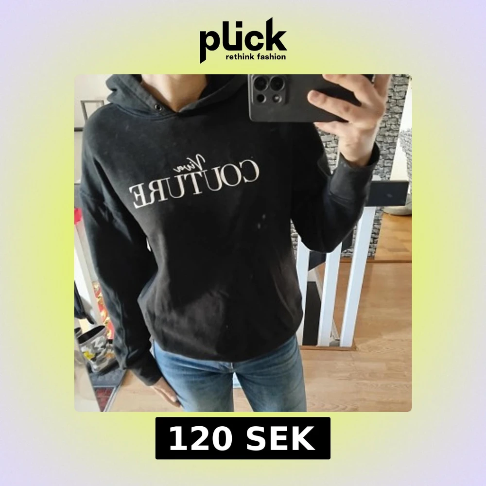 Säljer en svart hoodie med vit text på framsidan. Tröjan har en klassisk design med huva och långa ärmar. Perfekt för en avslappnad stil.