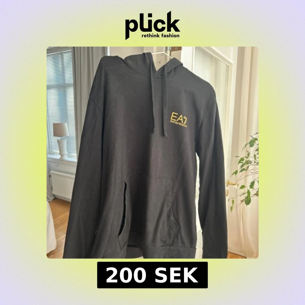 Svart hoodie från Emporio Armani - Säljer en stilren svart hoodie från Emporio Armani med EA7-logga på bröstet. Perfekt för en avslappnad look. Den har en klassisk huva och långa ärmar. Passar bra till både jeans och joggers.