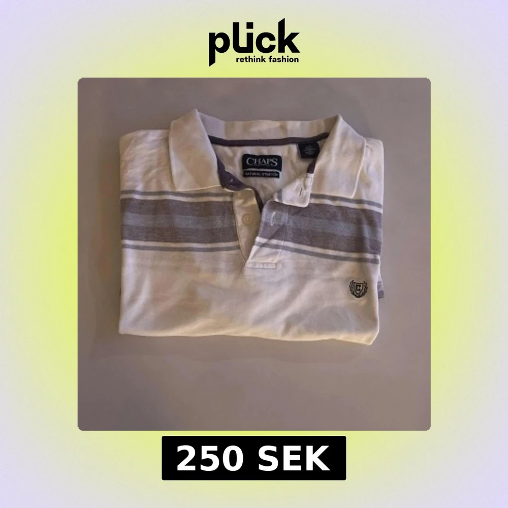 Säljer en stilren vit och grå randig pikétröja från Chaps. Tröjan har en klassisk krage och knappar framtill. Den är dekorerad med ett broderat emblem på bröstet. Perfekt för en avslappnad och snygg look.