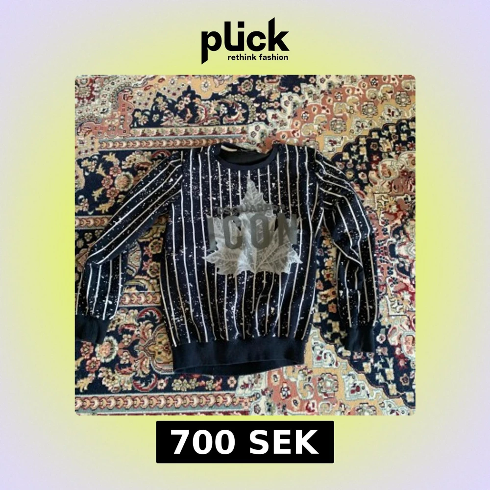 Säljer en cool svart och vit randig tröja från Dsquared2 med texten 'ICON' och ett stort lövtryck på framsidan. Tröjan är tillverkad i bomull och lycra för en bekväm passform. Perfekt för dig som vill sticka ut! Den passar även till storlek S