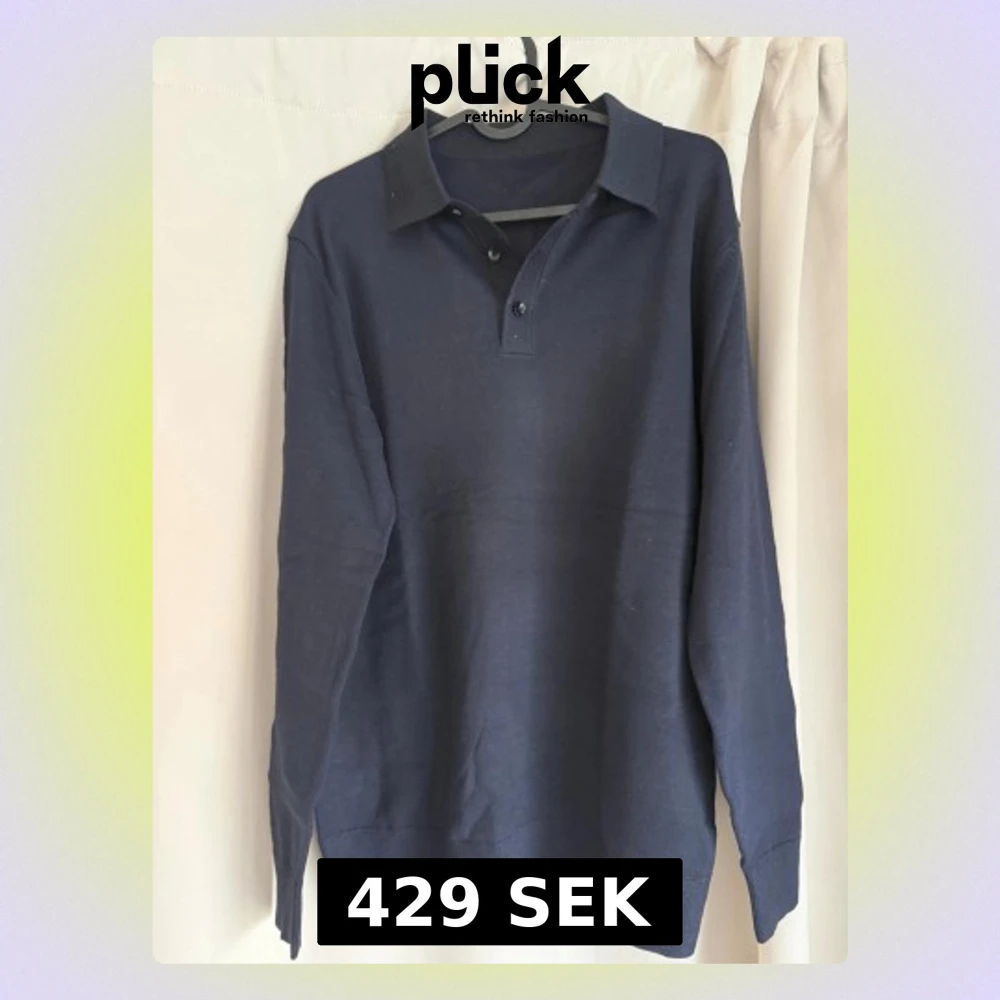 Klassisk mörkblå pikétröja med lång ärm och krage. Tröjan har knäppning med tre knappar vid halsen och ribbade muddar vid ärmslut och nederkant. Perfekt för en stilren och enkel look.