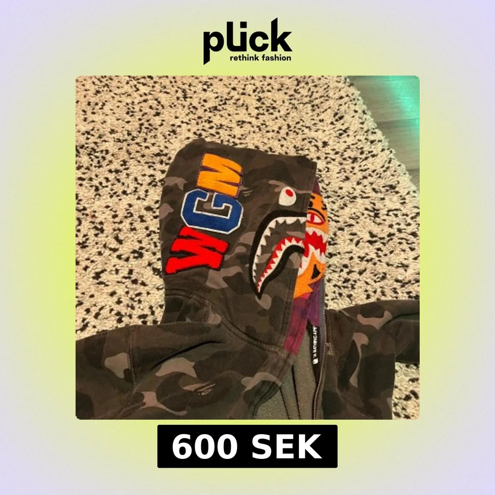 Säljer en cool camouflage hoodie från A Bathing Ape med ett hajmotiv på huvan. 💕Hoodien har en dragkedja framtill och färgglada detaljer i lila och orange. Perfekt för dig som vill sticka ut! Den är bra skick storlek L bara fråga om fler bilder eller frågor så svarar jag💕köpte den från min kusin först för 900 eller vad det va💕