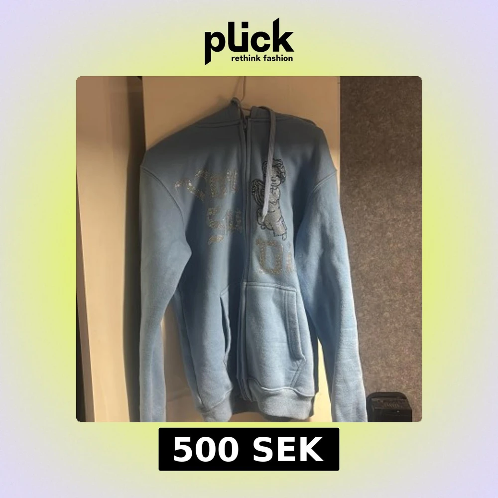 Ljusblå hoodie med dragkedja och huva. Framsidan har ett glittrigt tryck med text och en ängel. Perfekt för dig som gillar en chill och snygg stil med lite extra bling.