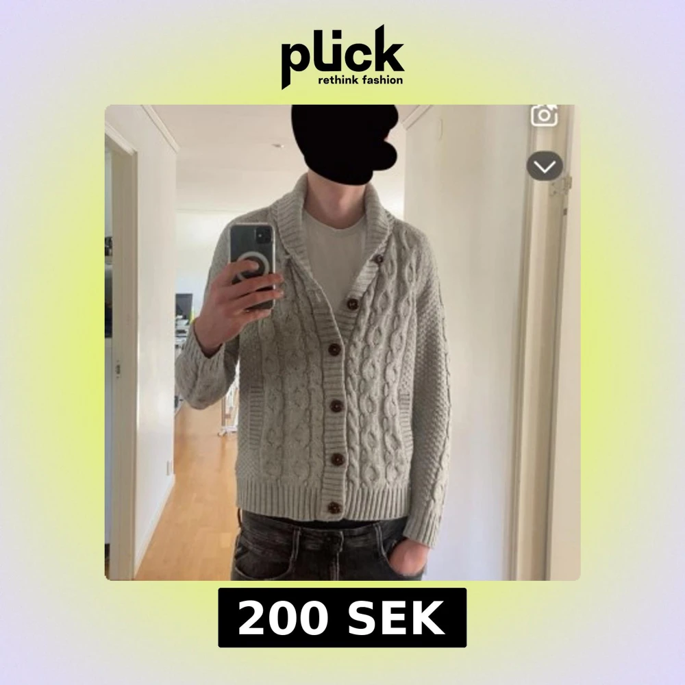 Säljer en stilren grå stickad kofta med knappar. Koftan har ett snyggt flätmönster och en bred krage som ger en extra touch. Perfekt för kyligare dagar. Tröjan passar personer mellan 187-193cm