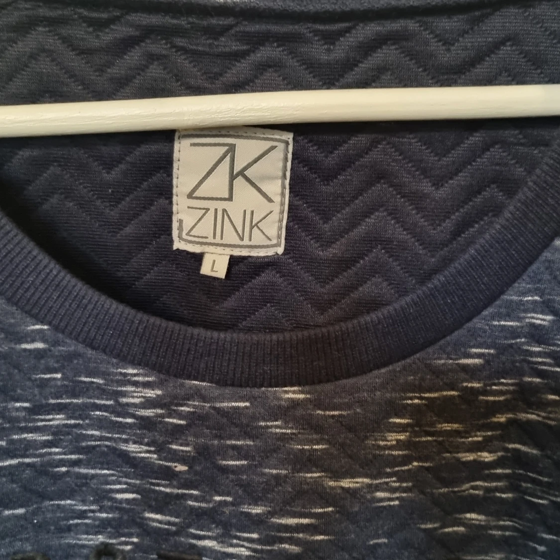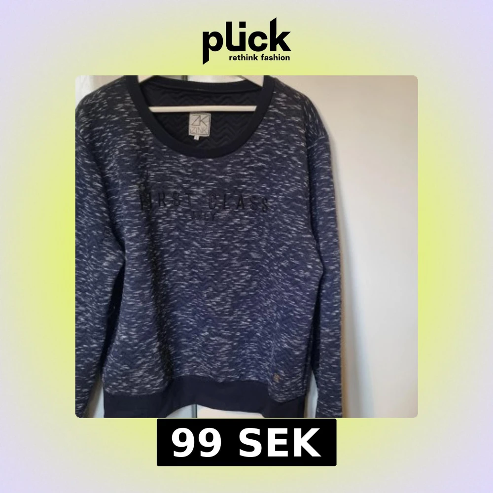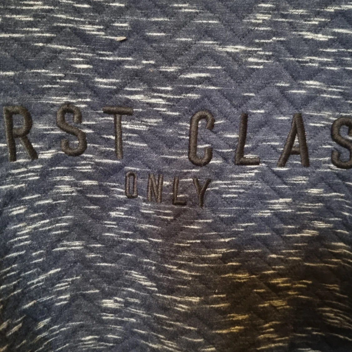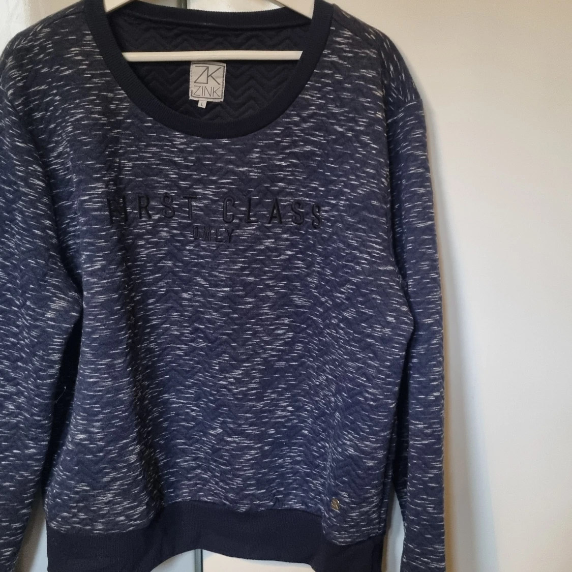 Säljer en mörkblå sweatshirt från Zink i storlek L med coolt zigzag-mönster och texten 'FIRST CLASS ONLY' broderad på bröstet. Tröjan har ribbade muddar och är långärmad, perfekt för chill dagar. Materialet är mjukt och känns skönt mot huden. Använd ett par ggr.