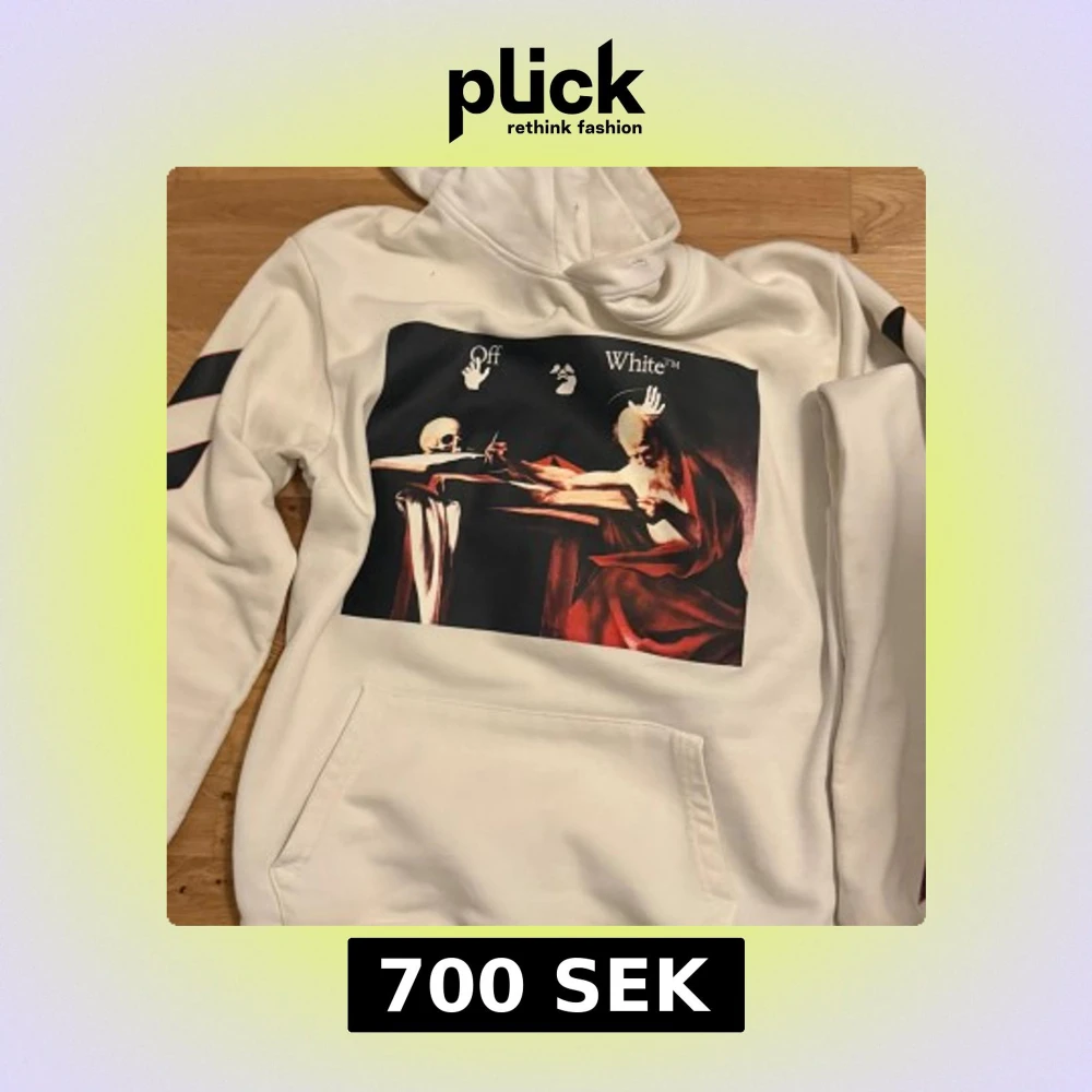 Säljer en vit hoodie från Off-White i 100% bomull med ikoniskt konsttryck framtill och stora pilar med motiv på ryggen. Hoodien har huva, känguruficka och svarta detaljer på ärmarna. Perfekt statement-plagg för dig som gillar streetwear. Storleken på koftan är L men den blev liten p grund av tvättmaskinen. Det kanske passar någon som har storlek S eller någon som är smal. Vi kan snacka om priset om du tycker att det för dyrt.