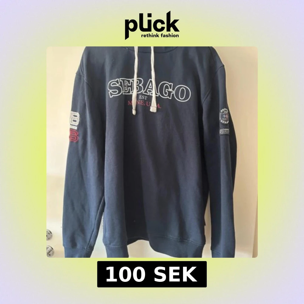 Säljer en svart hoodie från Sebago med tryck på bröstet och ärmen. Den har en justerbar huva med snören och ribbade muddar. Perfekt för en avslappnad stil.