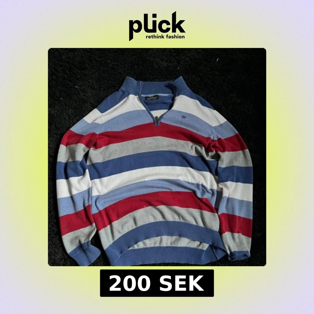 Säljer en randig tröja från Hampton Republic i blått, rött, grått och vitt. Tröjan har en dragkedja vid halsen och ribbade muddar. Perfekt för en avslappnad stil.