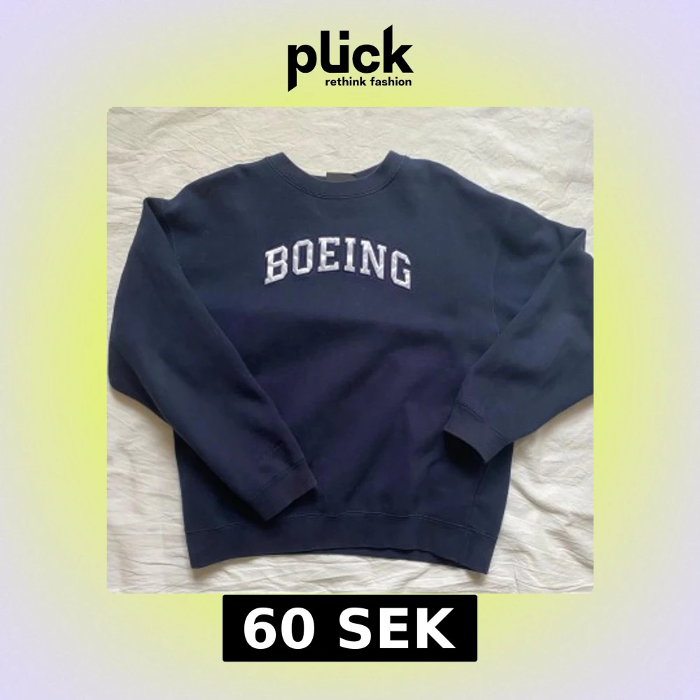 Säljer en mörkblå sweatshirt från Oarsman med texten 'BOEING' i vitt på framsidan. Tröjan är tillverkad i en bomulls- och polyesterblandning och är oversized