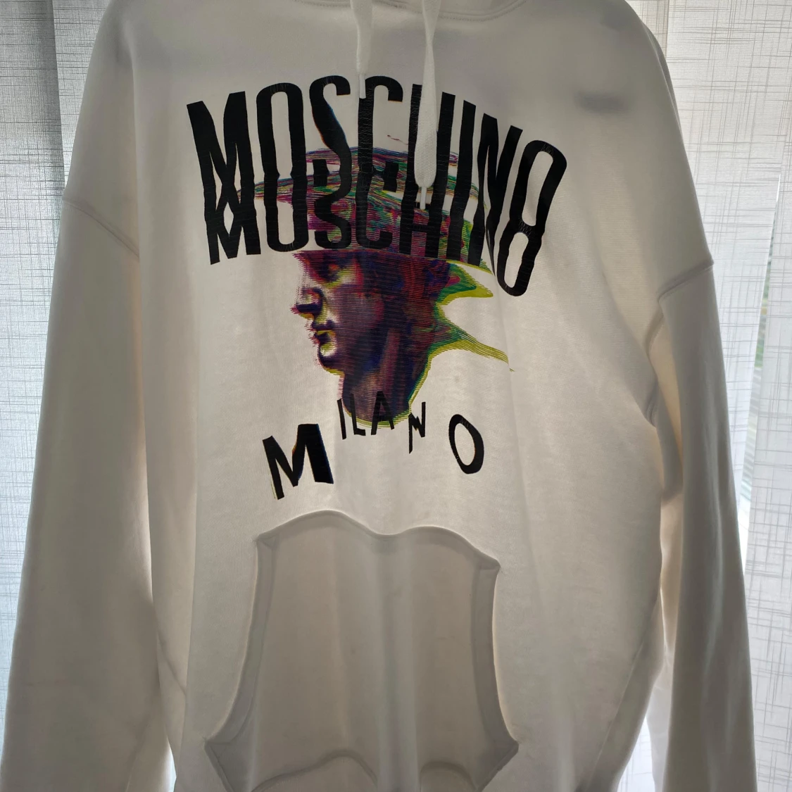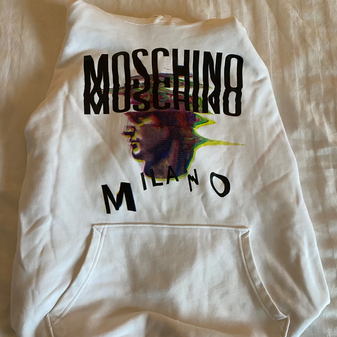 Snygg vit hoodie från Moschino med ett färgglatt tryck av ett ansikte och texten 'Milano'. Perfekt för en stilren och modern look. Hoodien har en klassisk passform med känguruficka och justerbar huva.