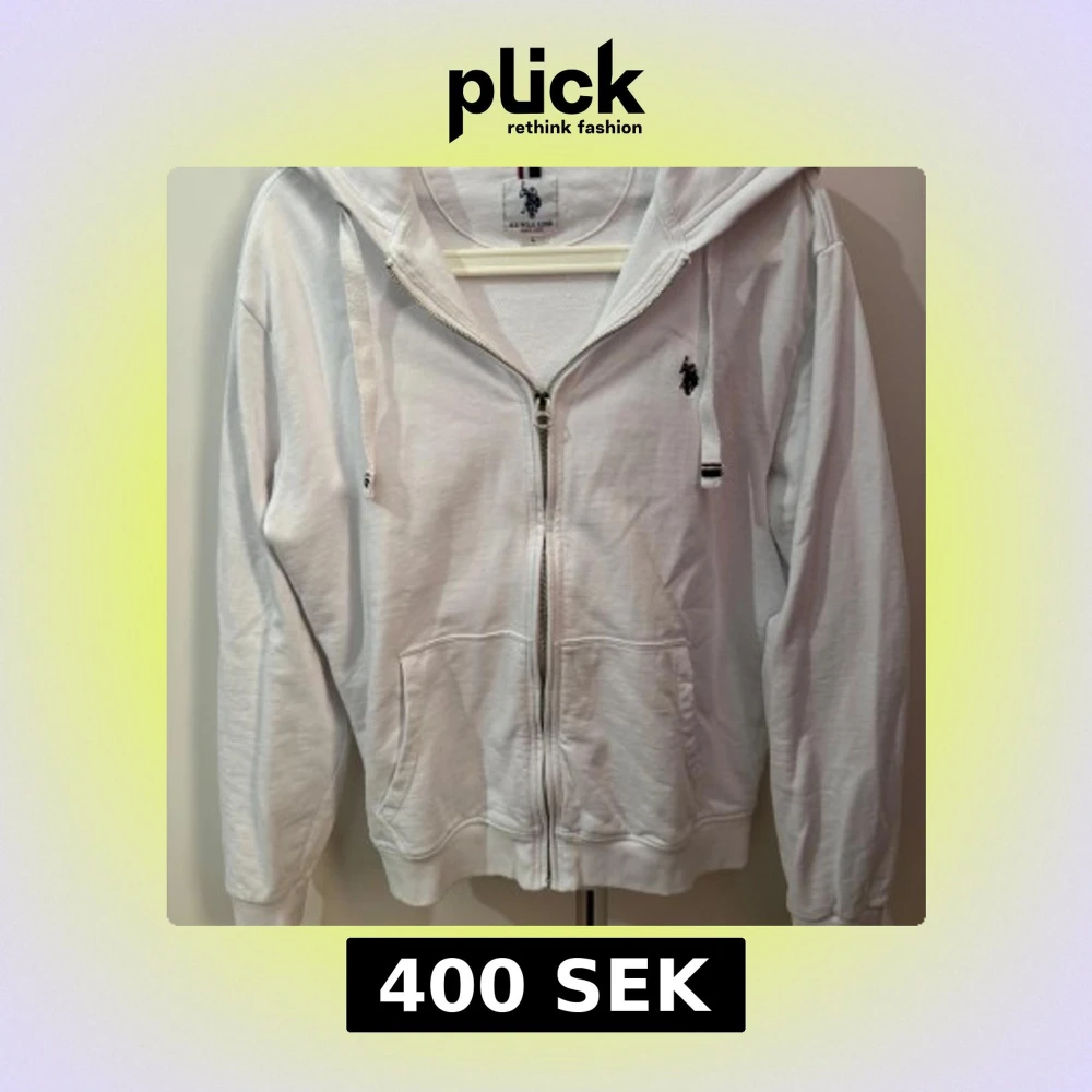 Säljer en stilren vit hoodie från U.S. Polo Assn. med dragkedja och broderad logga på bröstet. Den har en praktisk huva med snören och två fickor framtill. Perfekt för en avslappnad look.