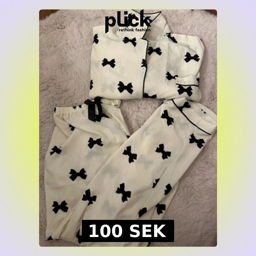 Säljer en vit pyjamasskjorta med svarta rosetter och svarta kantdetaljer. Skjortan har klassisk krage, knappstängning och en ficka framtill. Materialet är mjukt och har en lätt struktur. Matchande byxa med rosett i midjan ingår.