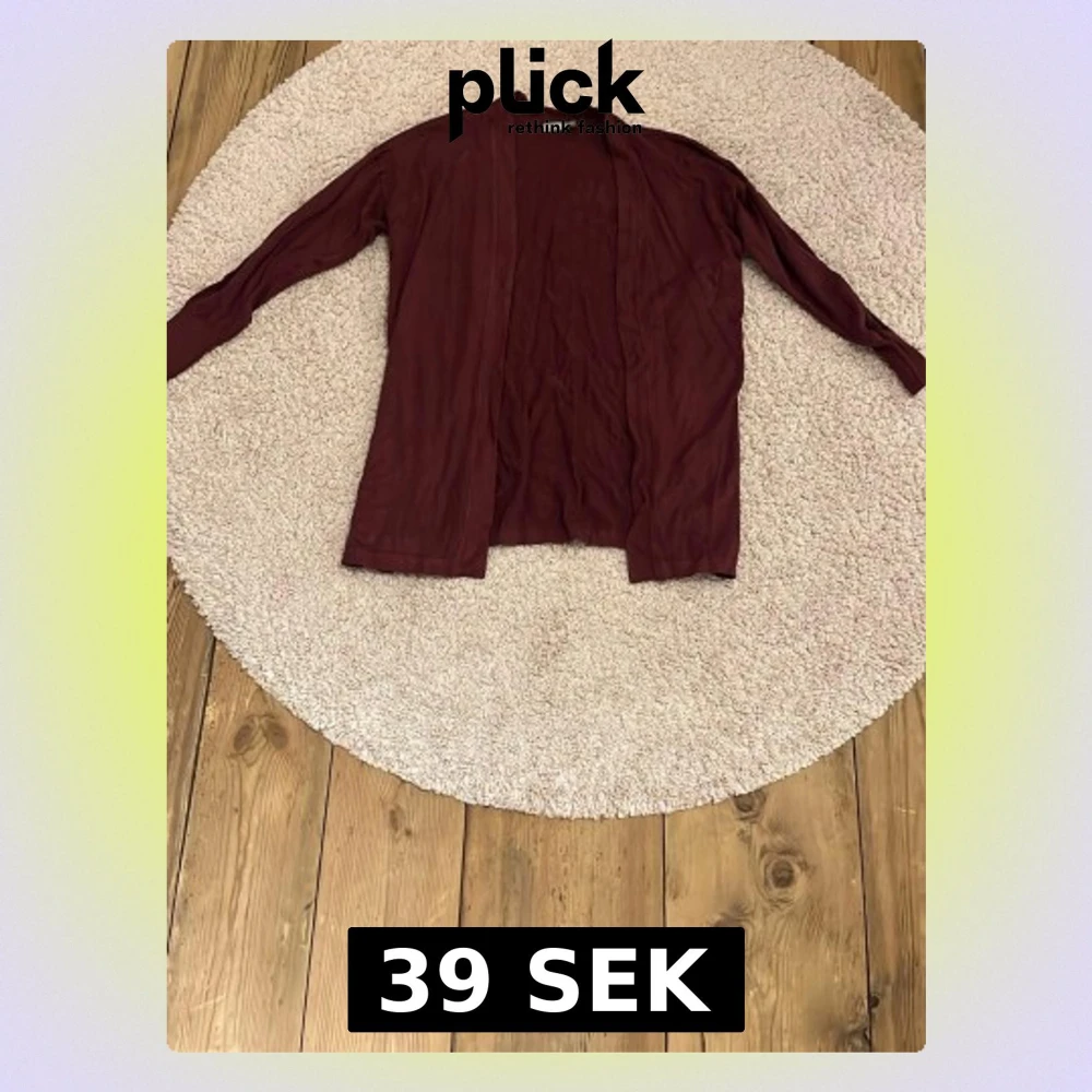Säljer en vinröd, långärmad kofta från Fransa i storlek L. Koftan har öppen front utan knappar och är gjord i ett mjukt, tunt material som känns skönt mot huden. Perfekt att slänga över en t-shirt eller linne när det blir lite kyligt.