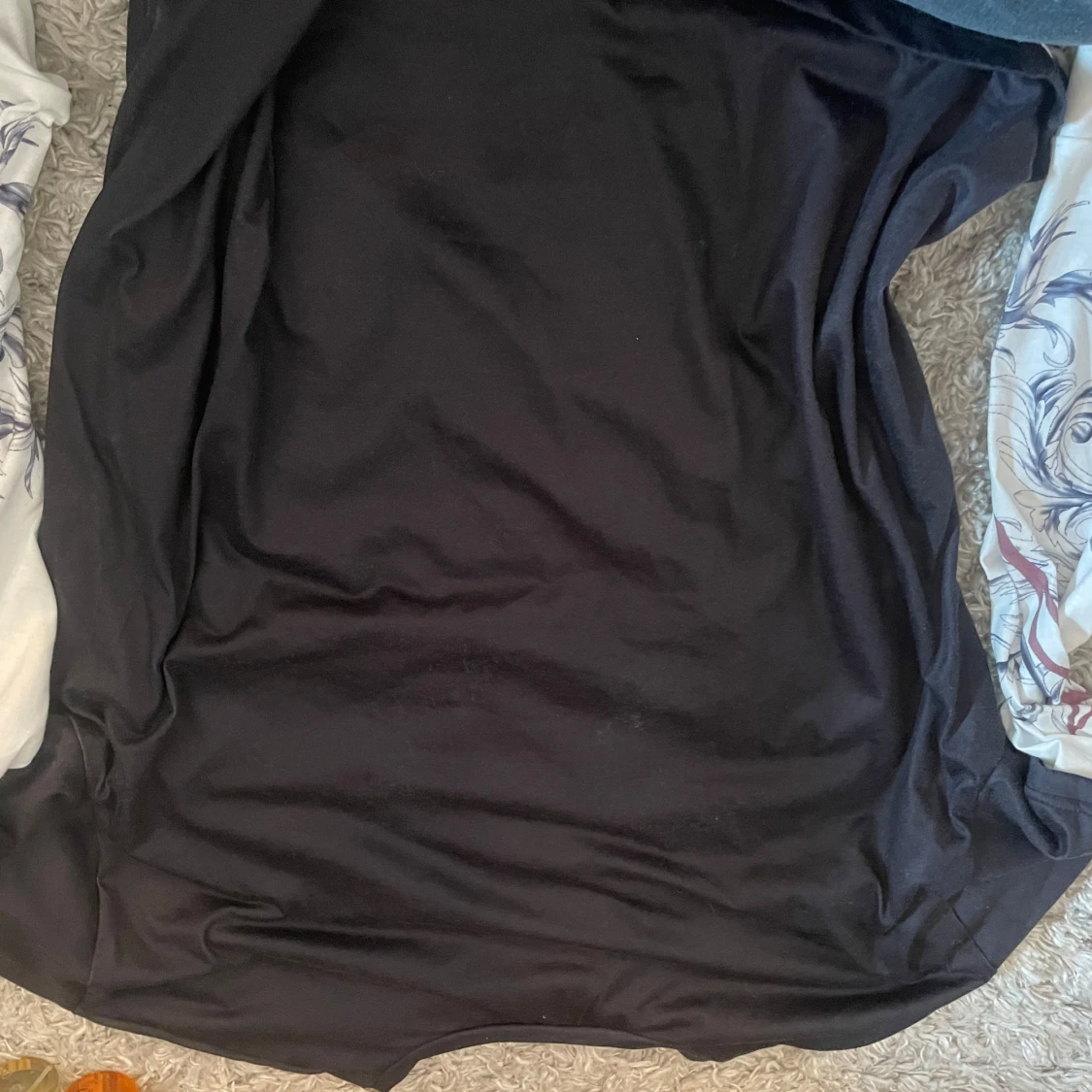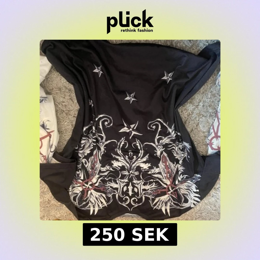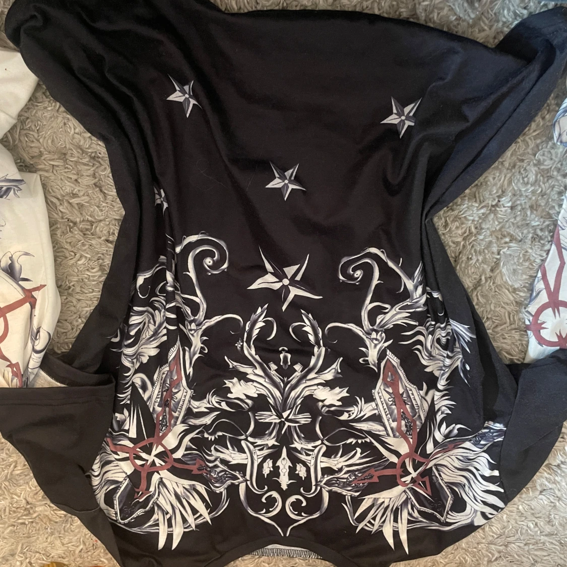 Säljer en svart tröja med ett detaljerat vitt och rött mönster. Tröjan har långa ärmar och ett unikt tryck med stjärnor och blommor. Perfekt för dig som vill ha något annorlunda i garderoben!