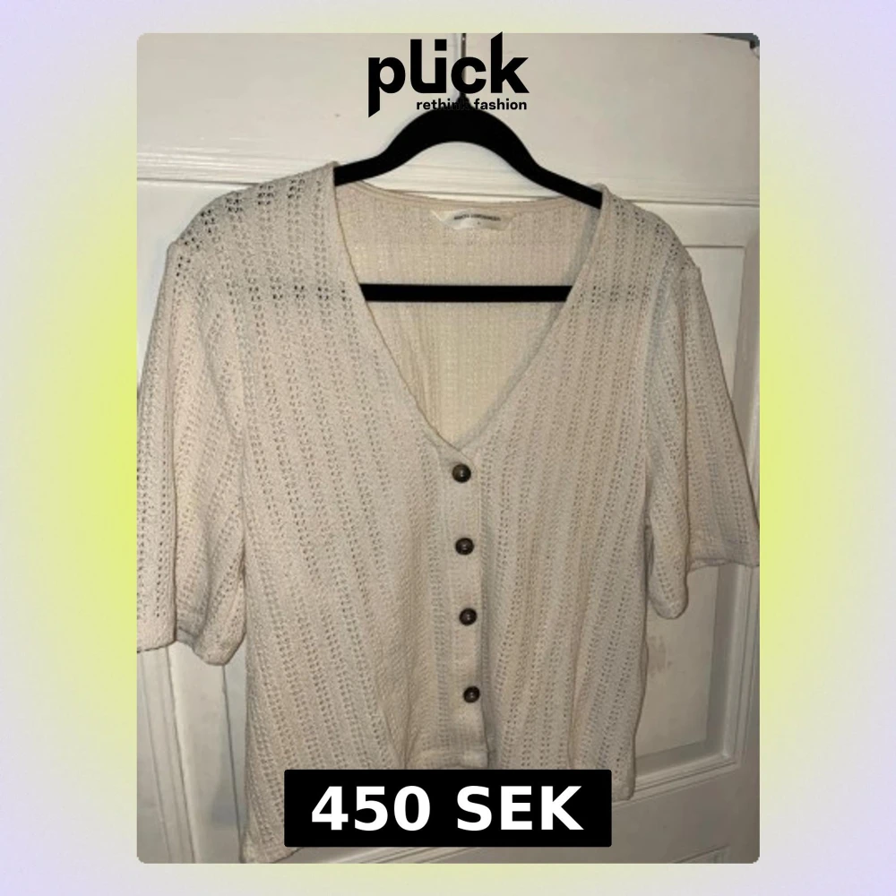 Säljer en ljusbeige/vit, stickad kofta från MSCH Copenhagen. Koftan har v-ringning, korta ärmar och snygga knappar framtill. Den är luftig och har ett diskret hålmönster som ger en chill och somrig eller vårig vibe.