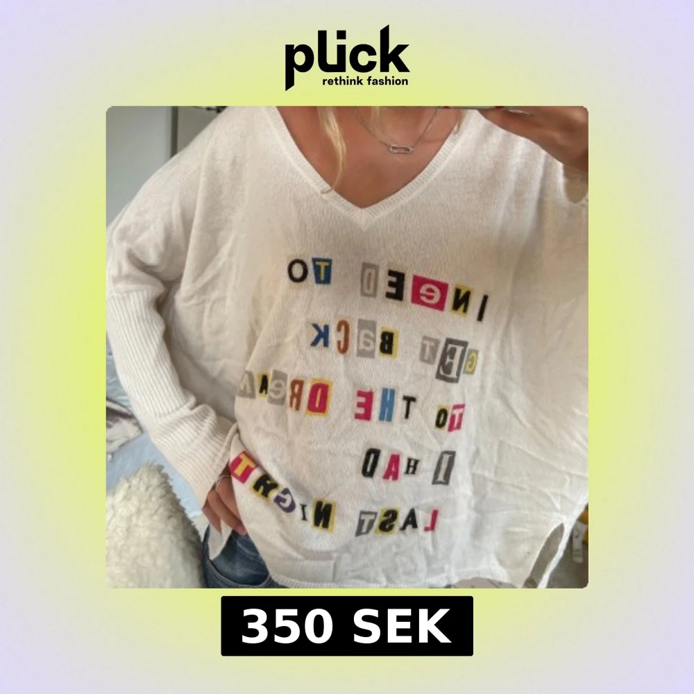 Vit, loose-fit tröja med v-ringning och långa ärmar. Framsidan har ett färgglatt texttryck i olika bokstäver och färger. Ärmarna är ribbstickade och tröjan har en avslappnad passform, perfekt för en chill och trendig look.
