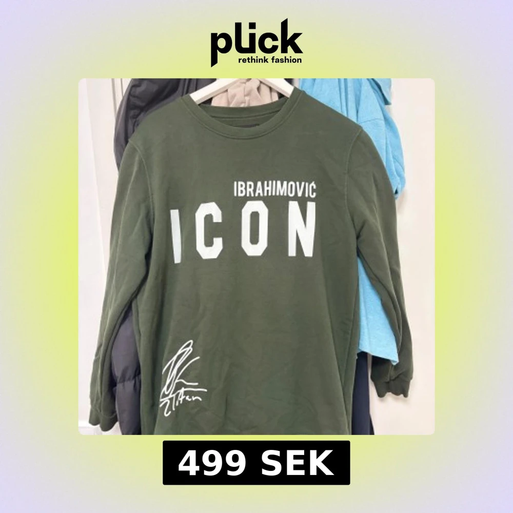 Säljer en grön långärmad tröja från Dsquared2 med stor vit text 'IBRAHIMOVIC ICON' framtill och coolt tryck samt citat på ryggen. Tröjan är i bomull och har en avslappnad passform. Perfekt för dig som gillar streetstyle och unika prints.