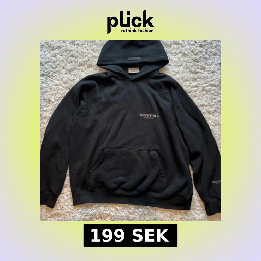 Säljer en svart hoodie från Essentials med liten logga på bröstet och ficka framtill. Tröjan har huva och långa ärmar, perfekt för en avslappnad stil.