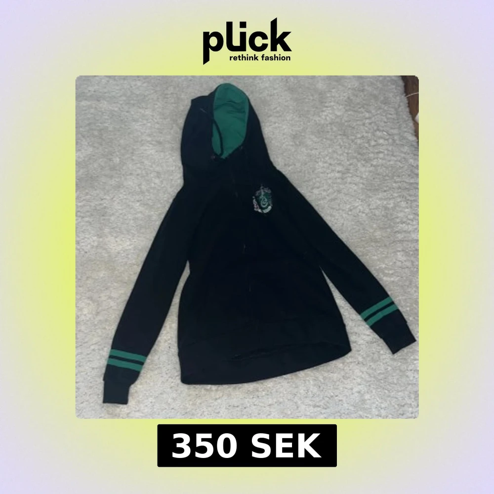Säljer en svart Harry Potter hoodie med gröna ränder på ärmarna och en grön insida av huvan. Den har en dragkedja framtill och ett emblem på bröstet. Perfekt för en avslappnad stil. Ny pris: 700