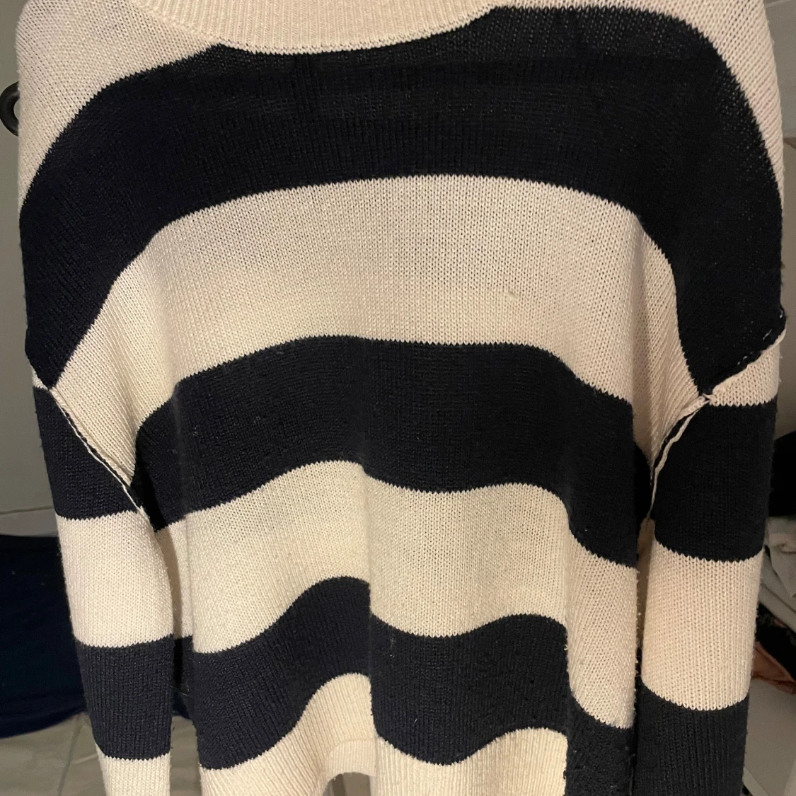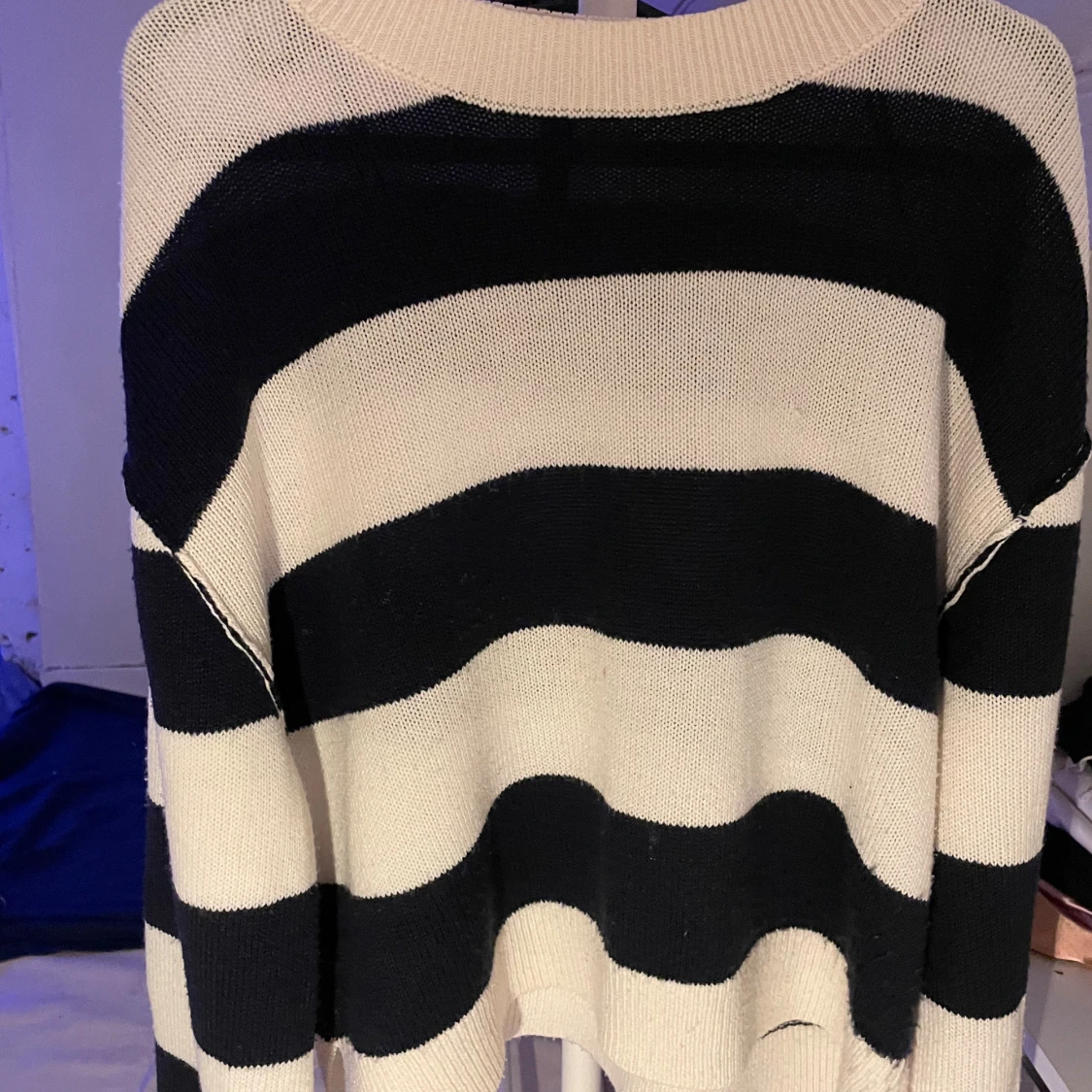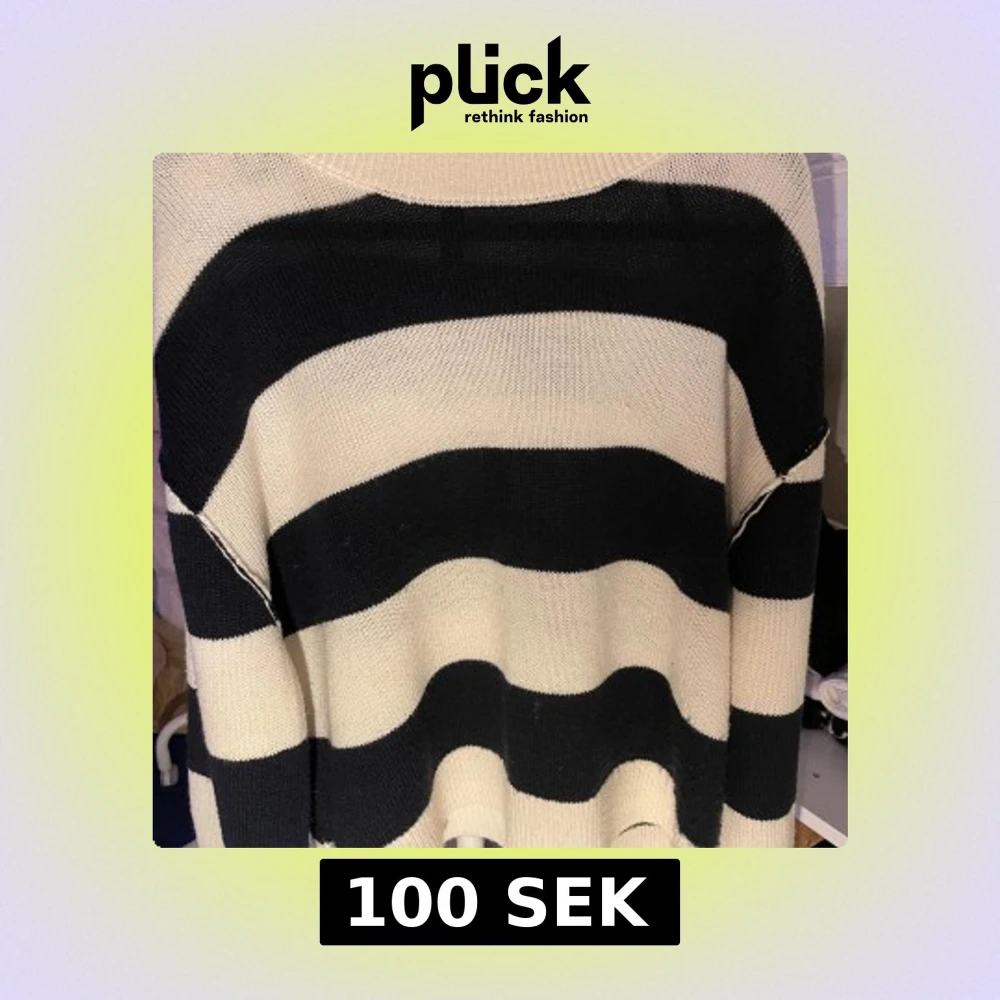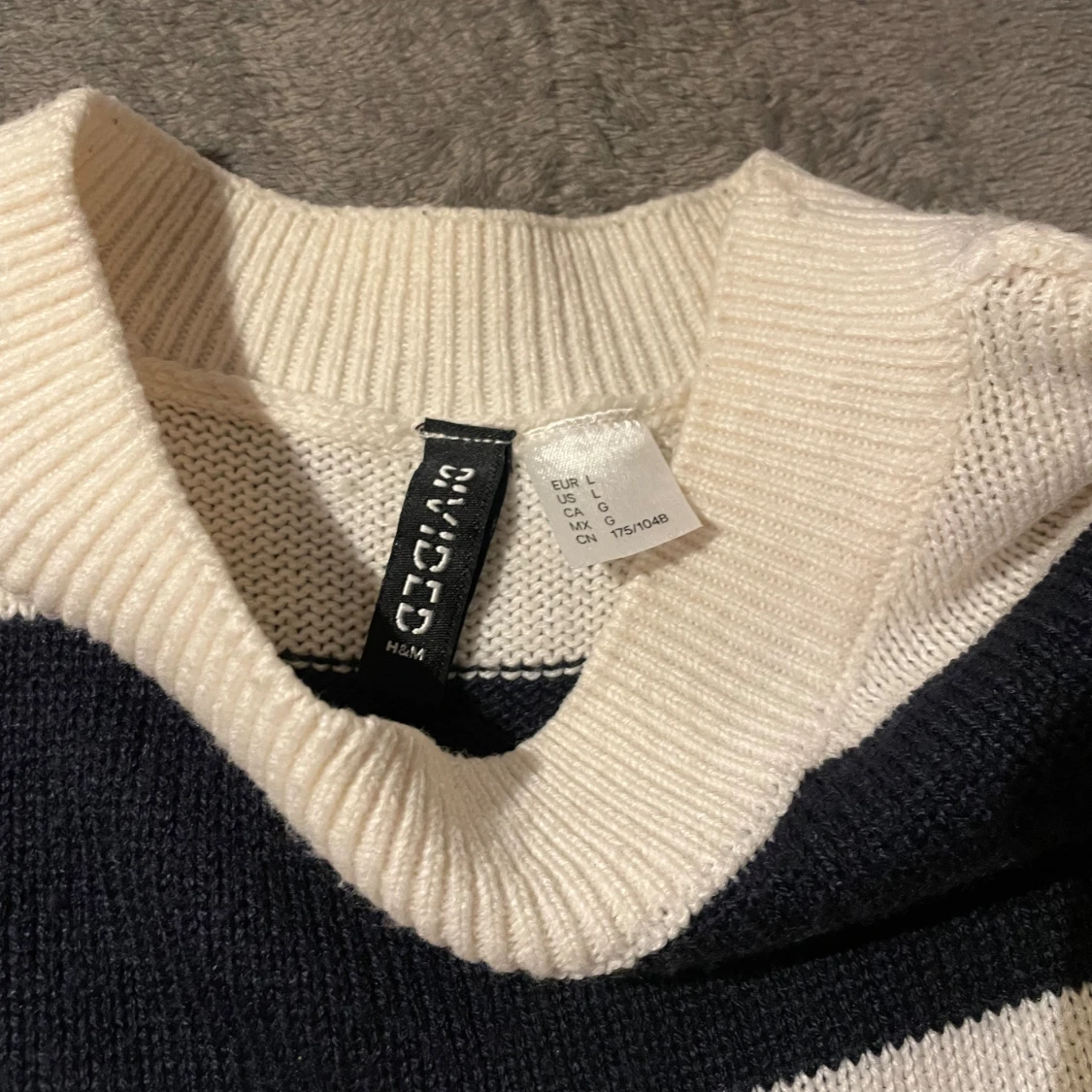 Säljer en oversized stickad tröja från H&M Divided i storlek L. Tröjan har breda svarta och vita ränder, rund halsringning och långa ärmar. Perfekt för lager-på-lager och chill dagar. Supermjuk och skön att ha på sig.