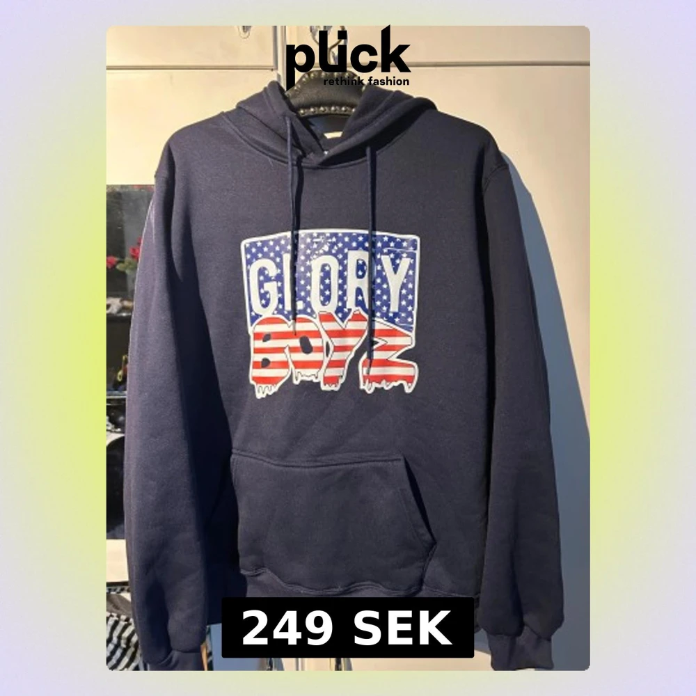 Snygg mörkblå hoodie från Glory Boyz med stort tryck på bröstet i amerikanska flaggans färger och stjärnor. Tröjan har huva med snörning, magficka och långa ärmar. Perfekt för dig som gillar streetwear och vill sticka ut.