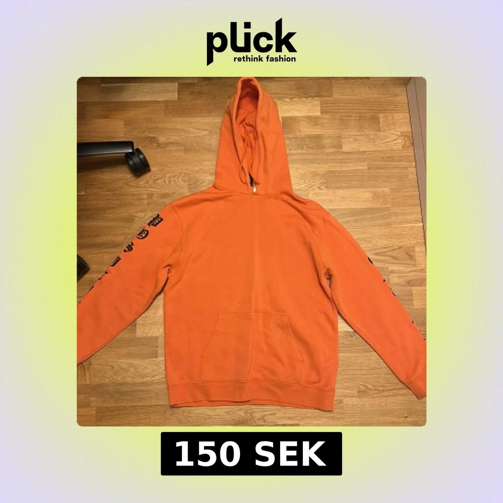 Säljer en orange hoodie från H&M Divided i storlek L. Tröjan har svart tryck längs båda ärmarna, stor huva med snörning och en klassisk magficka framtill. Perfekt för dig som gillar streetwear och vill sticka ut med färg.