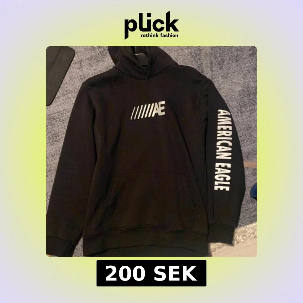 Svart hoodie från American Eagle med vit logga på bröstet och texten 'AMERICAN EAGLE' tryckt längs ena ärmen. Klassisk känguruficka framtill och huva. Perfekt för en chill och avslappnad stil.