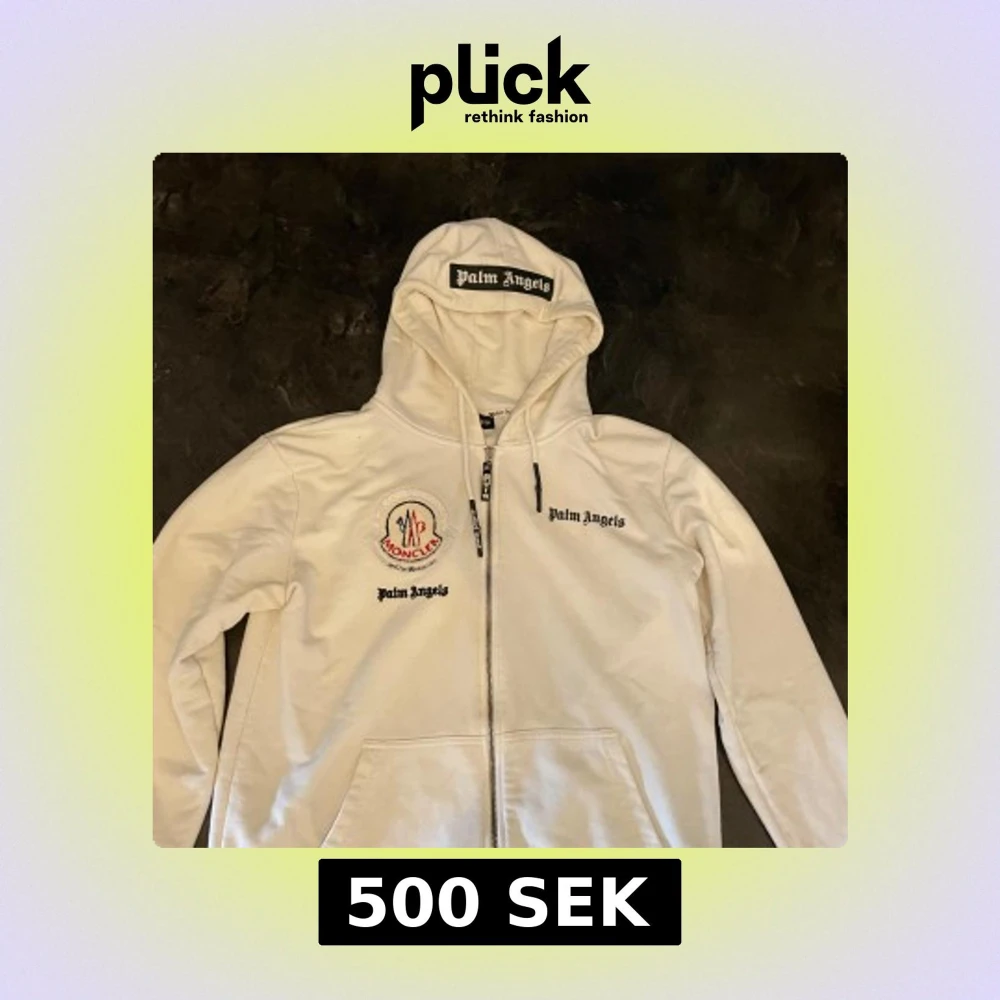 Säljer en vit hoodie med dragkedja från Palm Angels och Moncler. Tröjan har broderade loggor på bröstet och stor Palm Angels-tryck på ryggen. Huva med Palm Angels-märke. Perfekt för dig som gillar sticka ut .