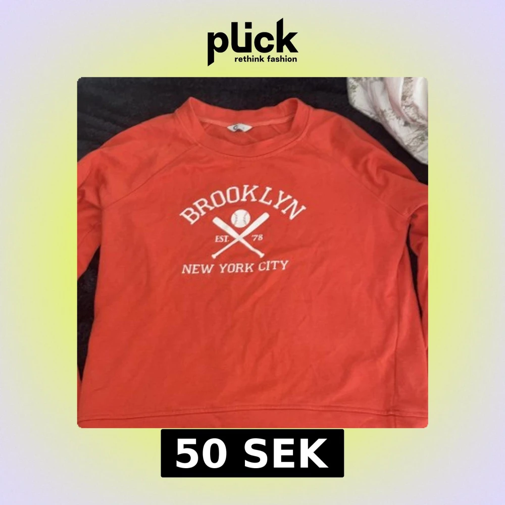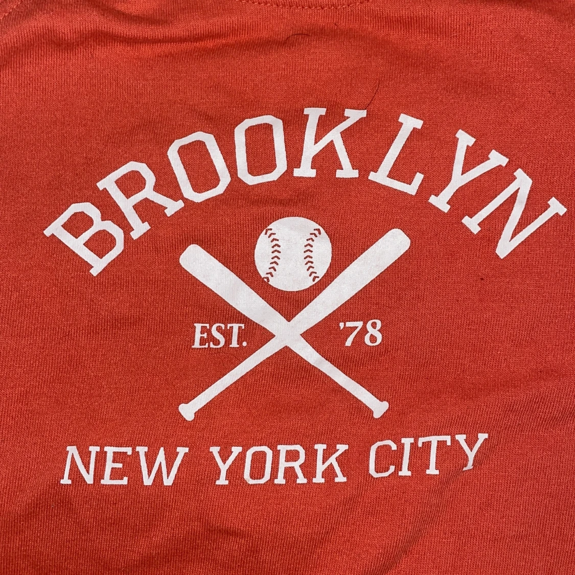 Röd sweatshirt med vit text och basebolltryck på bröstet där det står 'Brooklyn New York City'. Tröjan har rund halsringning och långa ärmar. Perfekt för dig som gillar sportig och avslappnad stil.