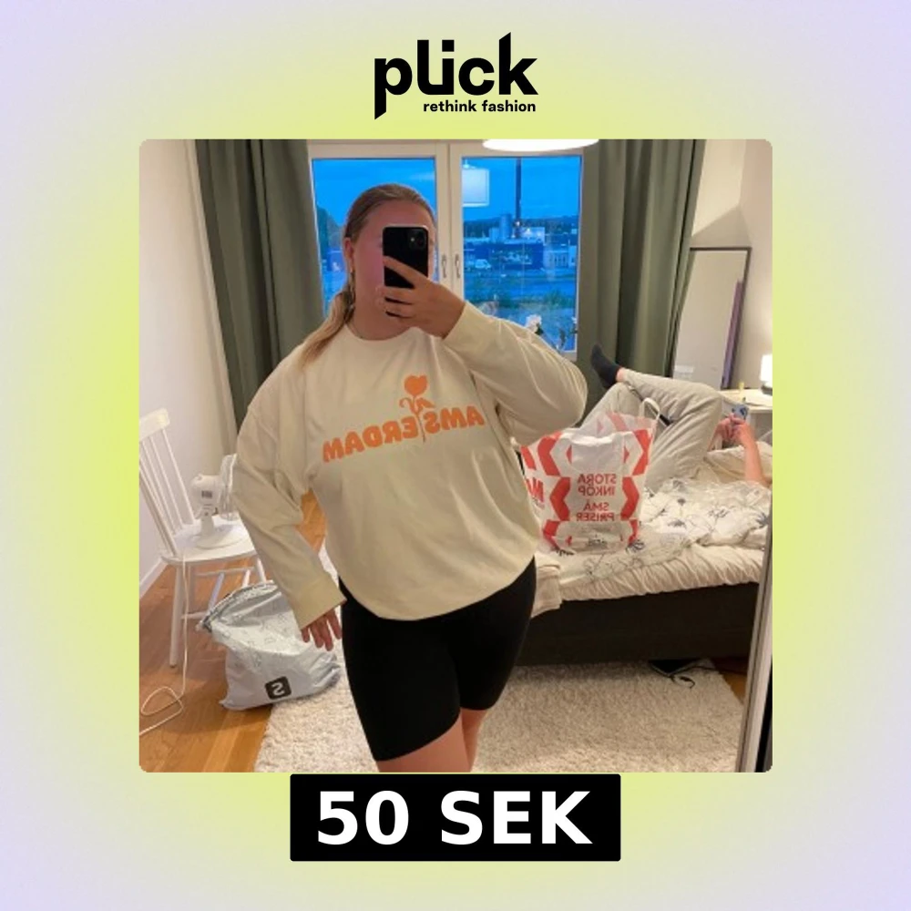 Säljer en vit oversized långärmad tröja med orange tryck där det står 'Amsterdam' och en tulpan på bröstet. Tröjan har en avslappnad passform och är perfekt för chill dagar. Helt ny