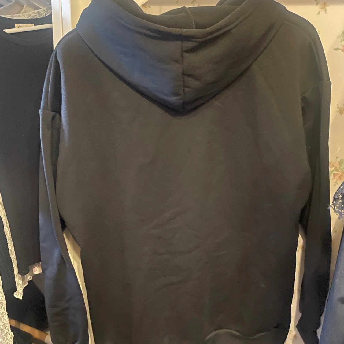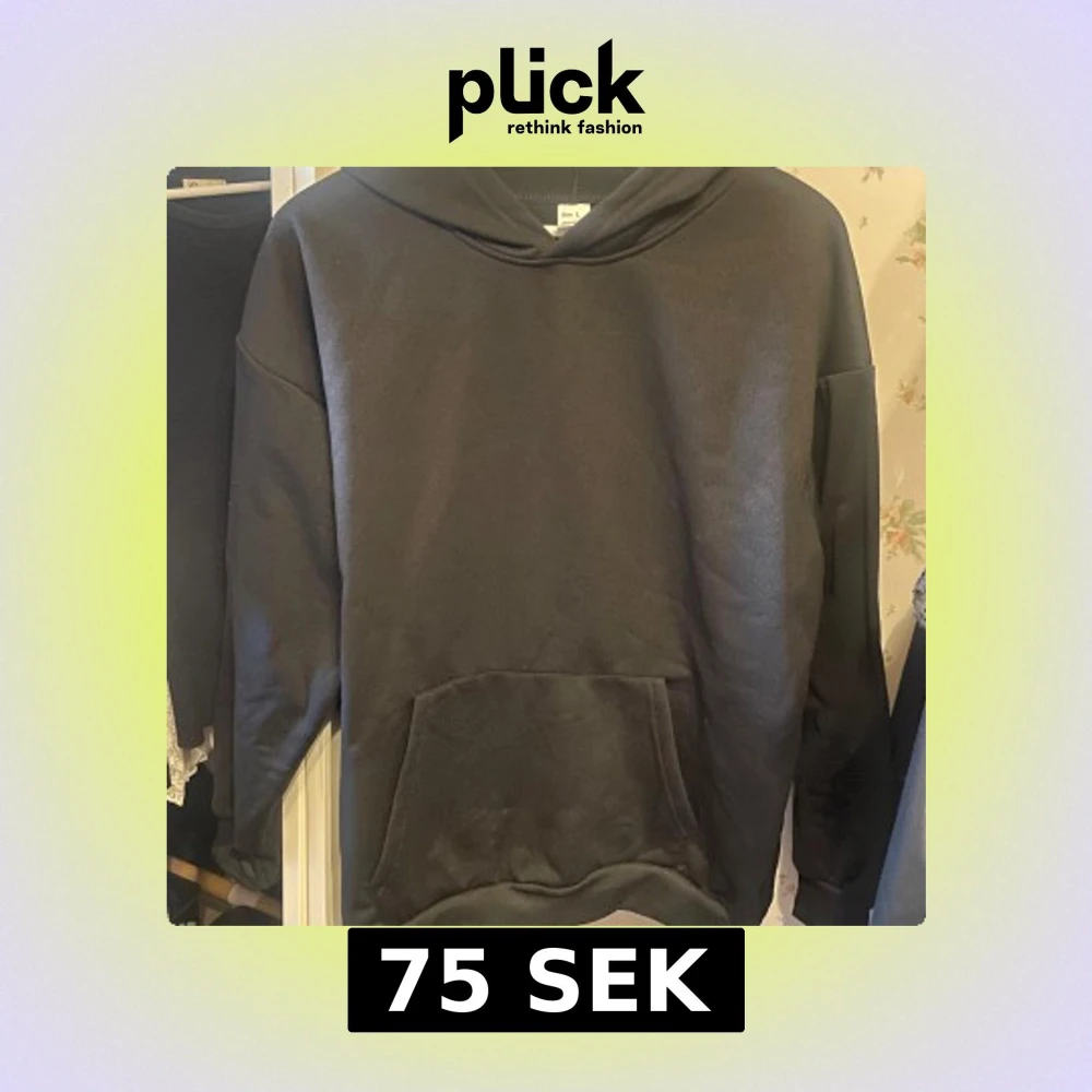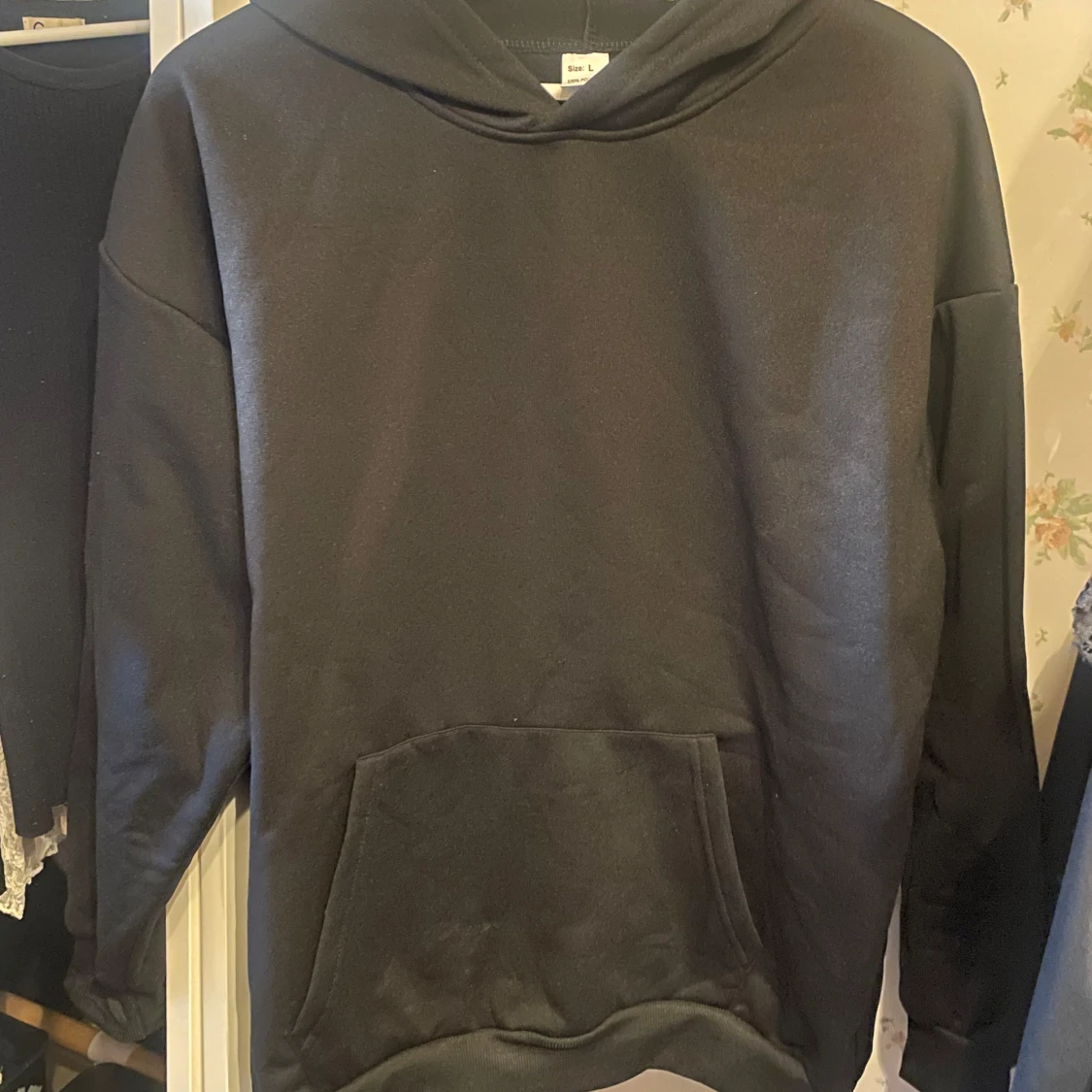 En svart hoodie i storlek L med klassisk känguruficka framtill och huva. Tillverkad i 100% polyester, perfekt för dig som gillar en enkel och stilren look. Passformen är normal och modellen har långa ärmar.
