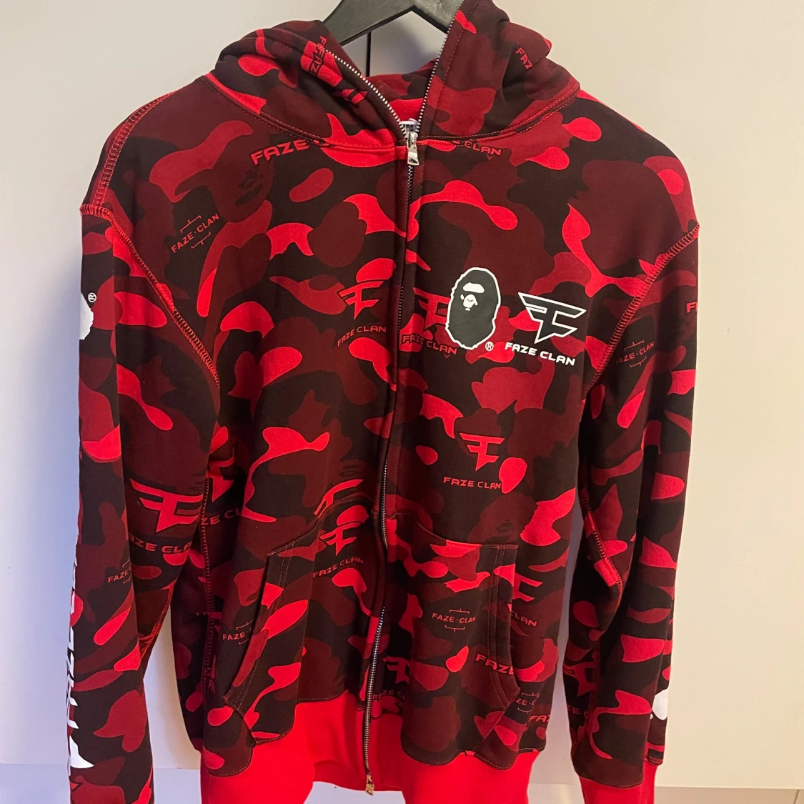 Säljer en cool röd och svart camo hoodie från A Bathing Ape i samarbete med FaZe Clan. Hoodien har dragkedja och en stor logga på ryggen. Perfekt för dig som gillar streetwear och gaming.
