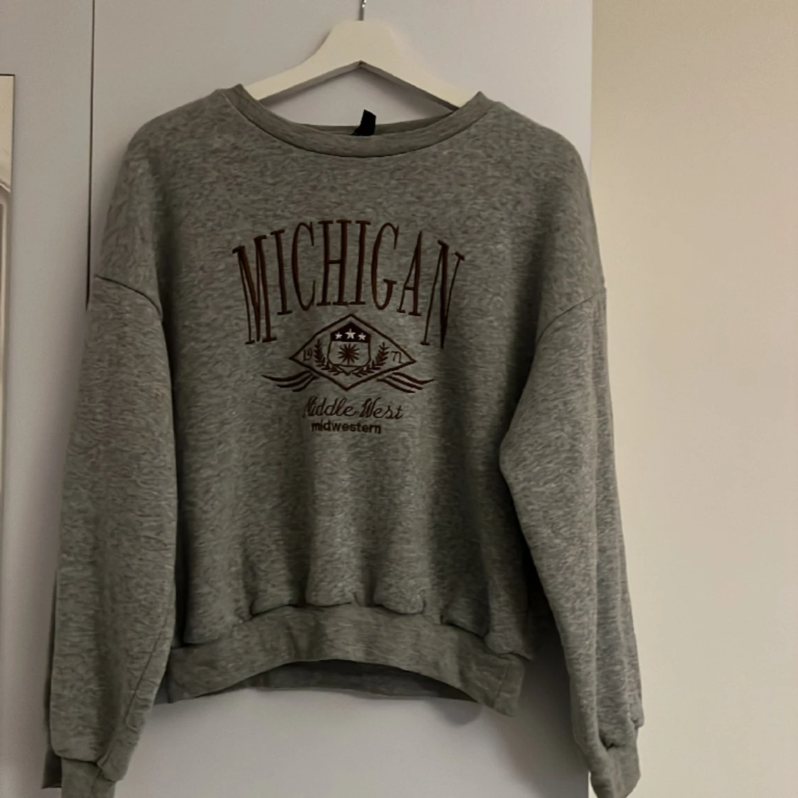 Grå tjocktröja med sytt ”tryck”. Väldigt mjuk på insidan