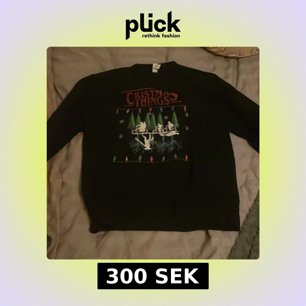 Svart tröja med tryck inspirerat av Stranger Things och texten 'Christmas Things'. Motiv med cyklande figurer, julgranar, snöflingor och färgglada ljusslingor. Perfekt för dig som gillar nördiga jultröjor och popkultur.