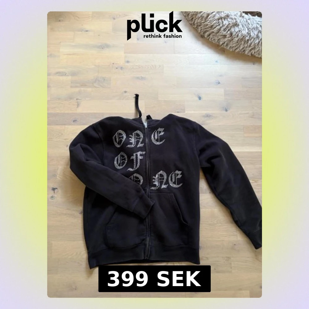 Svart hoodie med dragkedja och huva, dekorerad med stora bokstäver i silvrigt tryck som bildar texten 'ONE OF ONE' på framsidan. Tröjan har långa ärmar och två fickor framtill. Perfekt för dig som gillar streetwear och vill sticka ut.