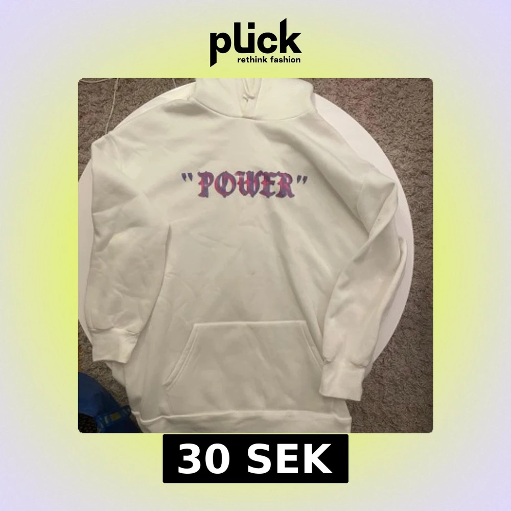 Säljer en vit hoodie med lila och rosa POWER-tryck på bröstet och stora färgglada vingar på ryggen. Hoodien har huva, magficka och långa ärmar. Perfekt statement-plagg för dig som vill sticka ut. Finns ingen lapp så osäker på storlek men skulle säga M-L❤️