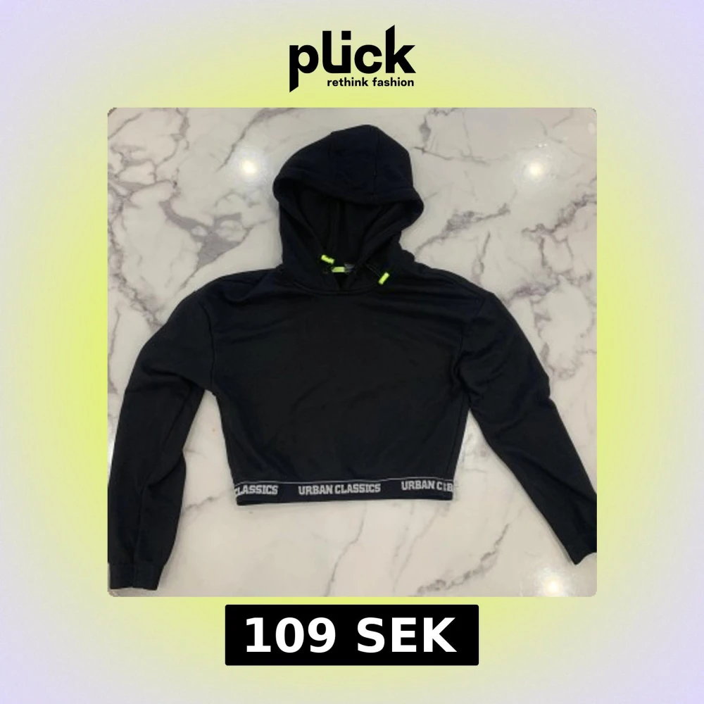 Säljer en svart croppad hoodie från Urban Classics med långa ärmar och huva. Den har en elastisk kant med Urban Classics-logga och neongröna detaljer vid dragsnörena.