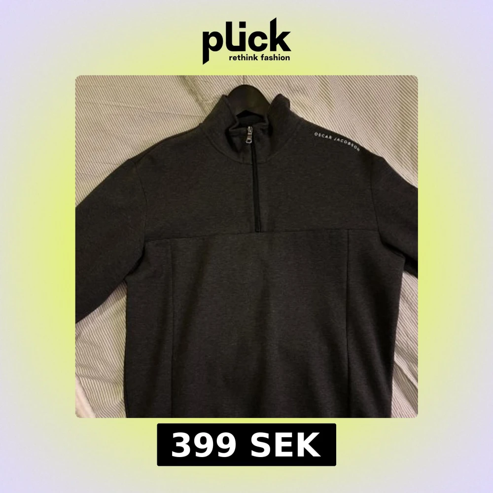 Säljer en stilren mörkgrå tröja från Oscar Jacobson med halv dragkedja och hög krage. Perfekt för en avslappnad men ändå elegant look. Tröjan har långa ärmar och är i ett mjukt material.