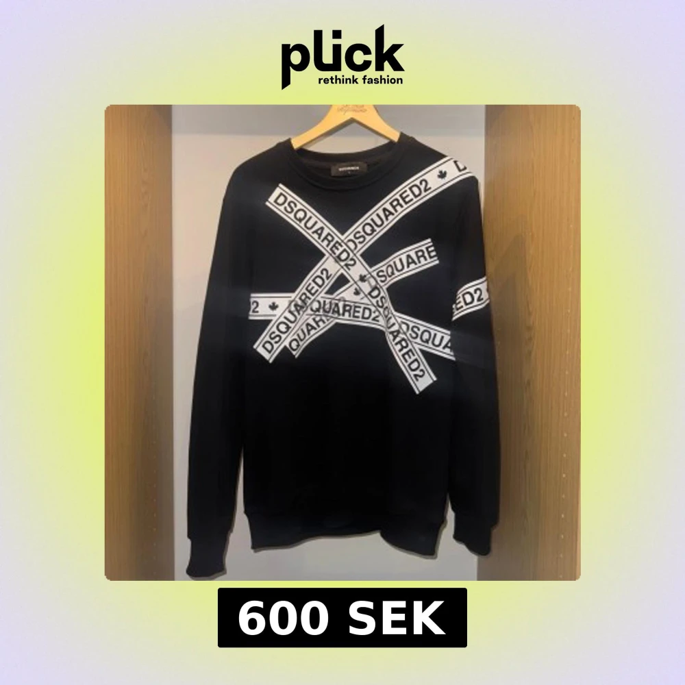 Svart sweatshirt från Dsquared2 i storlek L med vita tryckta band i kors över bröstet där det står DSQUARED2. Tröjan har rund halsringning och långa ärmar. Tillverkad i bomull och har en clean, modern look med tydlig logga framtill.
